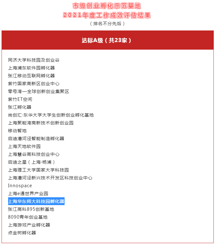 完美(中国)官方科技园在上海市级创业孵化示范基地2021年度工作成效评估中达标A级