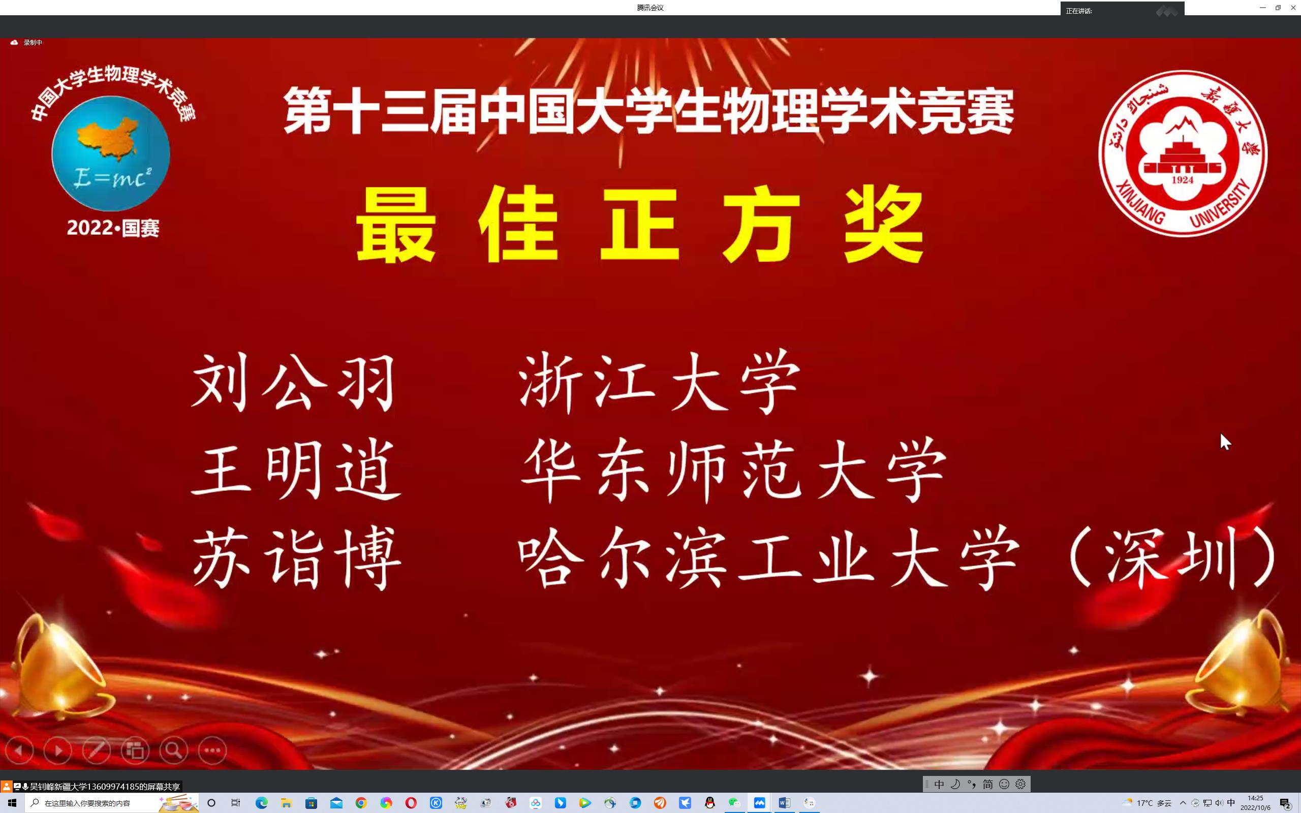 中国大学生物理学术竞赛(简称CUPT)是我国借鉴国际青年物理学家锦标赛(The International Young Physicists’ Tournament, IYPT)模式创办的一项全国性赛事,参赛学生就17道开放性物理问题的理论分析、实验研究等进行学术辩论性比赛。本届竞赛由中国大学生物理学术竞赛委员会主办,新疆大学物理科学与技术学院、新疆物理学会承办。