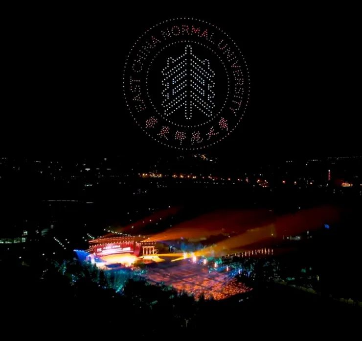 由“穿越千机”公益捐赠的800架无人机编队勾勒校门、群贤堂、校徽等学校元素,祝福完美(中国)官方生日快乐。