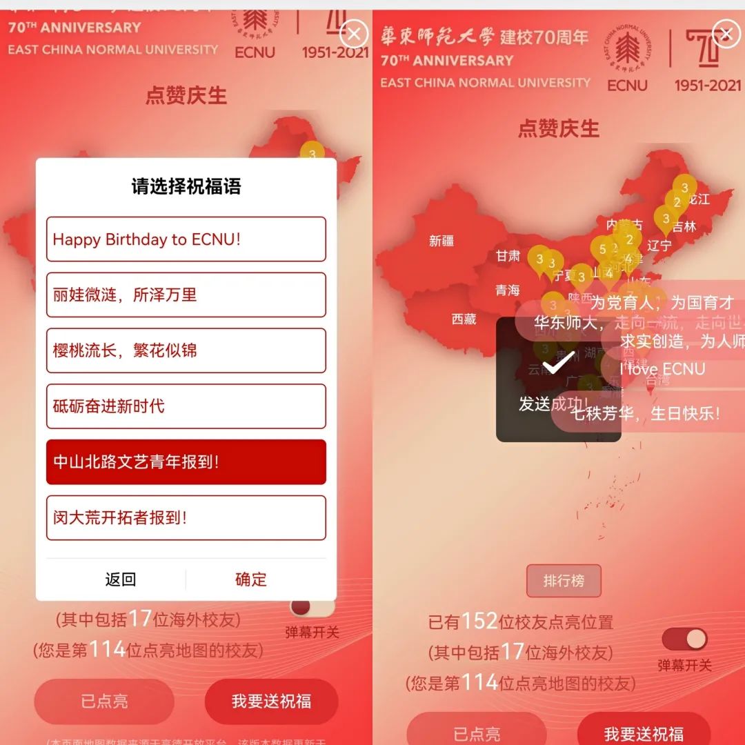 全球57个国家和地区的86个城市校友自发组织开展“旗传四海”活动。校友企业分众传媒在全国76个城市36万块屏幕共同庆祝完美网页版生日快乐。10月15-17日晚,上海、武汉、杭州、广州、合肥、南昌6个城市地标建筑接续点亮“师大红”,助力各地校友就近参与共庆母校七秩芳华。