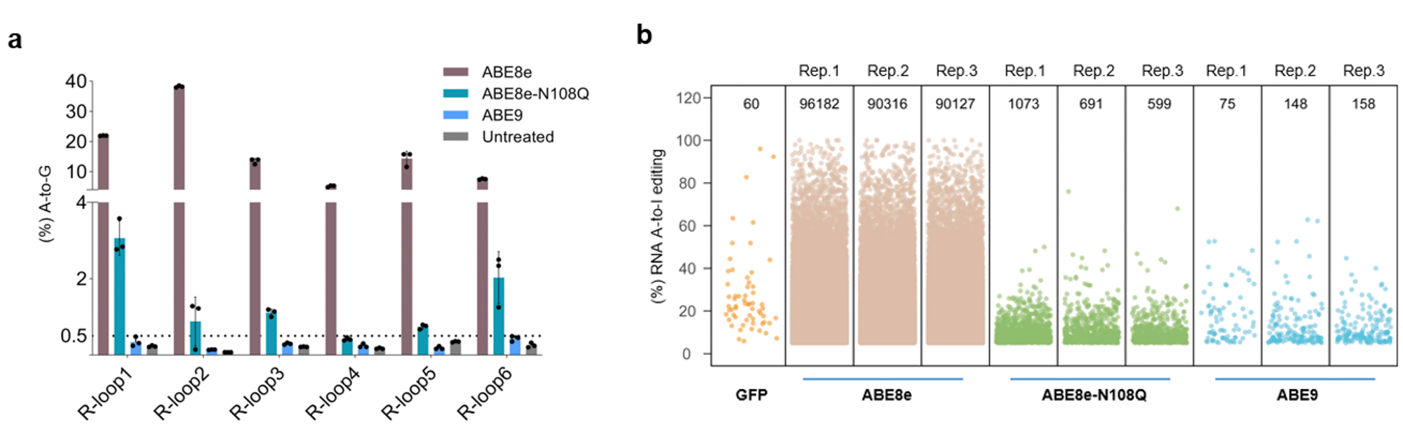 DNA碱基编辑器是一种创新的基因组编辑工具,它可以在不产生DNA双链断裂(DSB)、不需要供体DNA模板的情况下高效地催化碱基转换,因此在种质改良和基因治疗中被寄予厚望。碱基编辑技术最早由哈佛大学David R. Liu团队开发,他们通过将Cas9酶活突变型蛋白(nickase Cas9)分别与胞嘧啶脱氨酶或者腺嘌呤脱氨酶融合开发出初代的胞嘧啶碱基编辑器(Cytosine base editor, CBE)和腺嘌呤碱基编辑器(Adenine base editor, ABE)[1, 2]。由于碱基切除修复通路的激活,CBE除了诱导C到T的碱基转化,也会一定程度上产生非T的副产物和Indels (插入和缺失事件)。且最近高彩霞、杨辉等课题组陆续报导了CBE处理的细胞和胚胎中存在严重的随机脱靶现象[3, 4]。与CBE不同的是,第一代的ABEs (如ABE7.10, ABEmax) 几乎只产生纯的A到G的转换(≥99.9%),而不诱导显著的Indels (通常≤0.1%)[2]。更重要的是,ABE7.10极少诱导非Cas9依赖的脱靶编辑。这些优秀的特性使得ABEs在未来的临床应用中有许多优势。然而,ABE7.10的编辑效率对于很多靶点而言不尽如人意,David Liu等课题组通过分子进化获得了更高活性的ABE8 (ABE8e和ABE8s)[5, 6],但是ABE8并没有解决ABE原有的缺陷。例如,ABE会引起的大量随机的RNA脱靶编辑。此外,由于ABE8编辑窗口变宽,还会引起非目标碱基改变而产生旁观者效应以及ABE会在特定的TCN motif的背景序列中诱导胞嘧啶碱基的转换[6-8]。