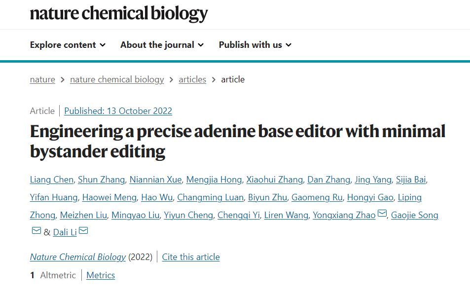 研究论文以“Engineering precise adenine base editor with minimal bystander editing”为题在 Nature Chemical Biology 杂志上发表。