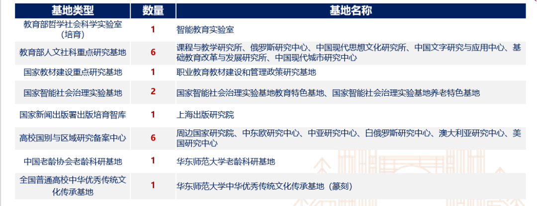 加强基地内涵建设,全面提升哲学社会科学创新能力和服务水平。围绕国家和区域发展重大需求、行业和科学前沿领域,以教育部人文社科基地为牵引,涵育人才队伍,产出《社会教育力:概念、现状与未来指向》《人与世界:以事观之》等一批有显示度、标志性的学术成果。6家教育部人文社科重点研究基地“十三五”建设评估获得高度认可。职业教育教材建设和管理政策研究基地入选首批全国11家国家教材建设重点研究基地。