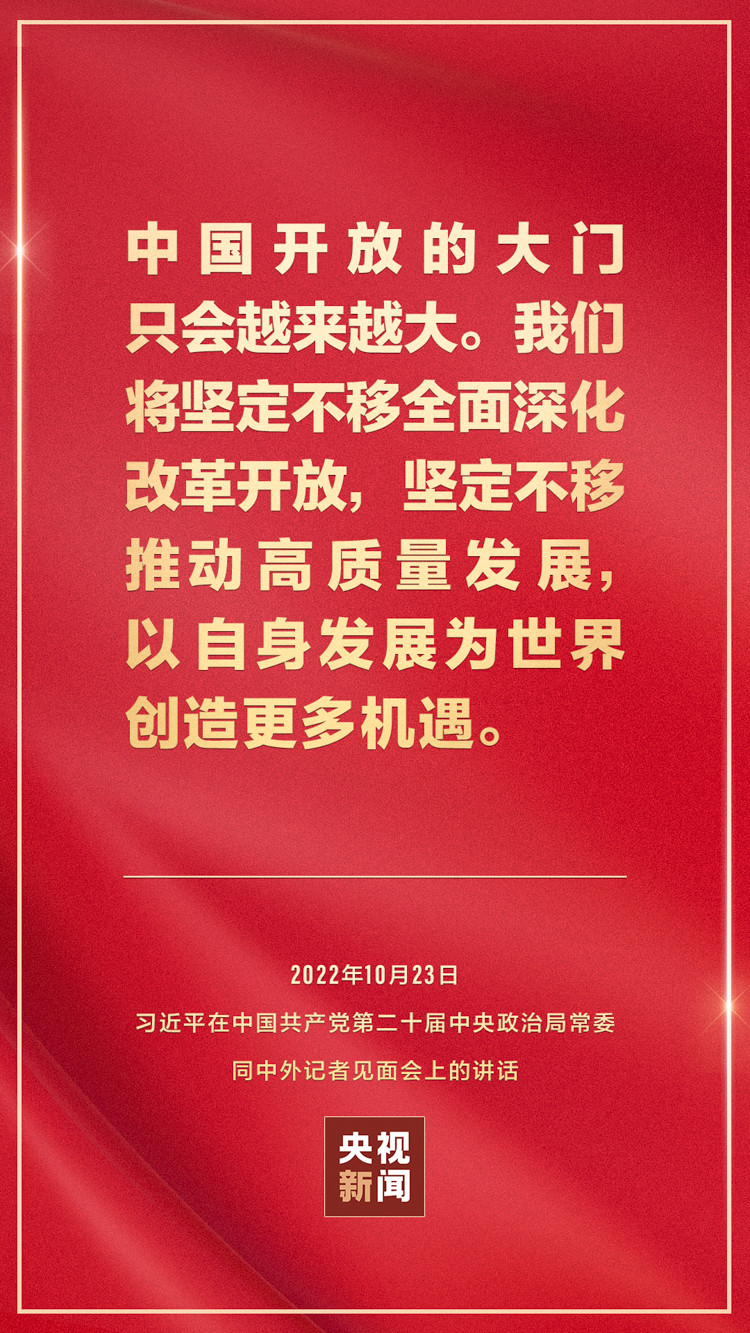 中国发展离不开世界,世界发展也需要中国。经过改革开放40多年不懈努力,我们创造了经济快速发展和社会长期稳定两大奇迹。现在,中国经济韧性强、潜力足、回旋余地广,长期向好的基本面不会改变。中国开放的大门只会越来越大。我们将坚定不移全面深化改革开放,坚定不移推动高质量发展,以自身发展为世界创造更多机遇。