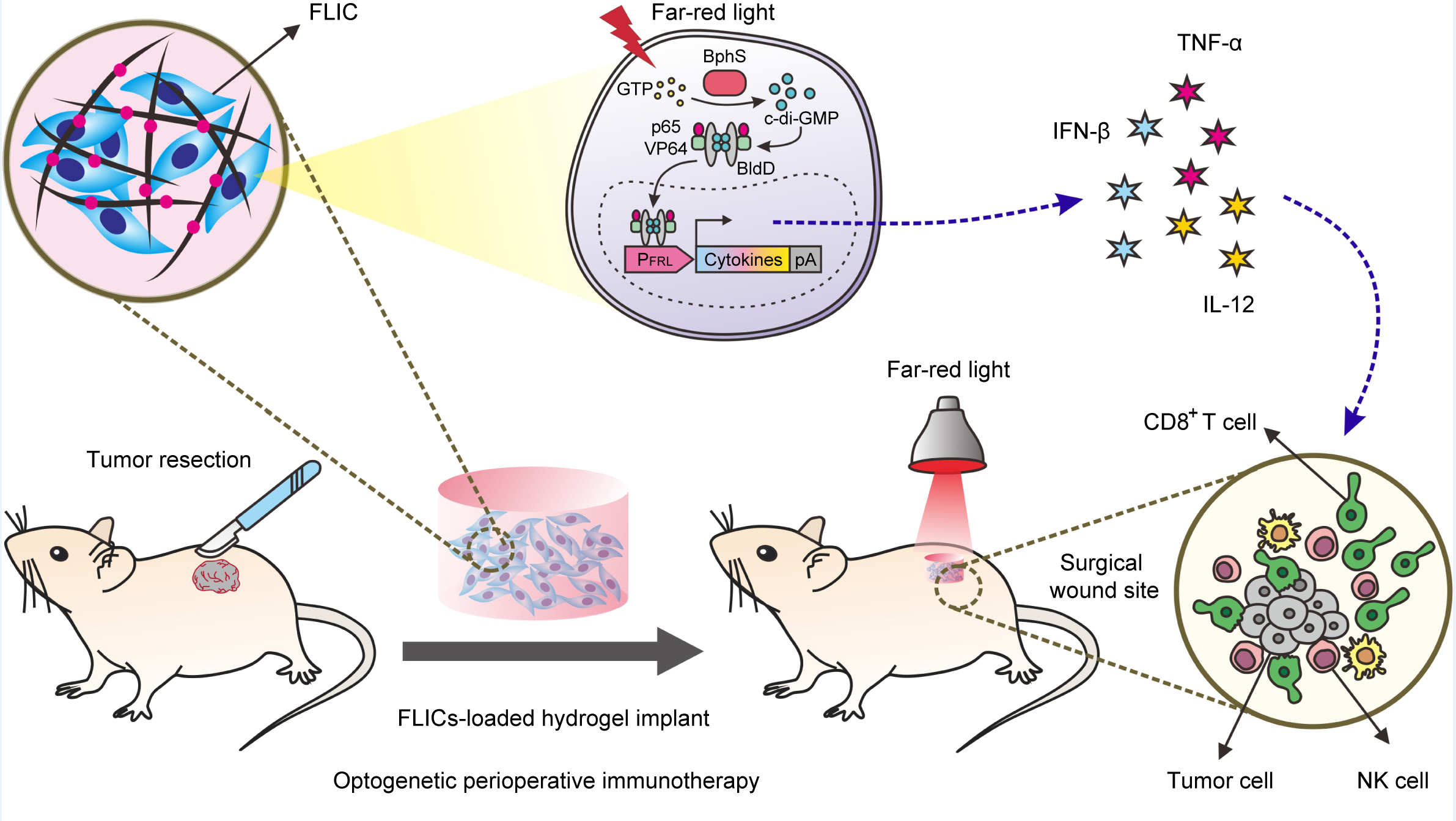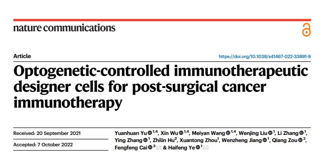 上述研究成果于2022年10月26日以“Optogenetic-controlled immunotherapeutic designer cells for post-surgical cancer immunotherapy”为题在 Nature Communications 期刊上发表,该研究开发的远红光调控的新型肿瘤免疫疗法既可以解决肿瘤手术切除疗法易复发和转移的问题,也可以避免肿瘤免疫疗法起效慢以及不可控性产生的非特异性过度激活问题,显著地提高肿瘤手术切除治愈率。该疗法开启了免疫抗癌新思路,同时也扩展了光控系统在生物医学领域的应用,具有潜在的临床转化意义。