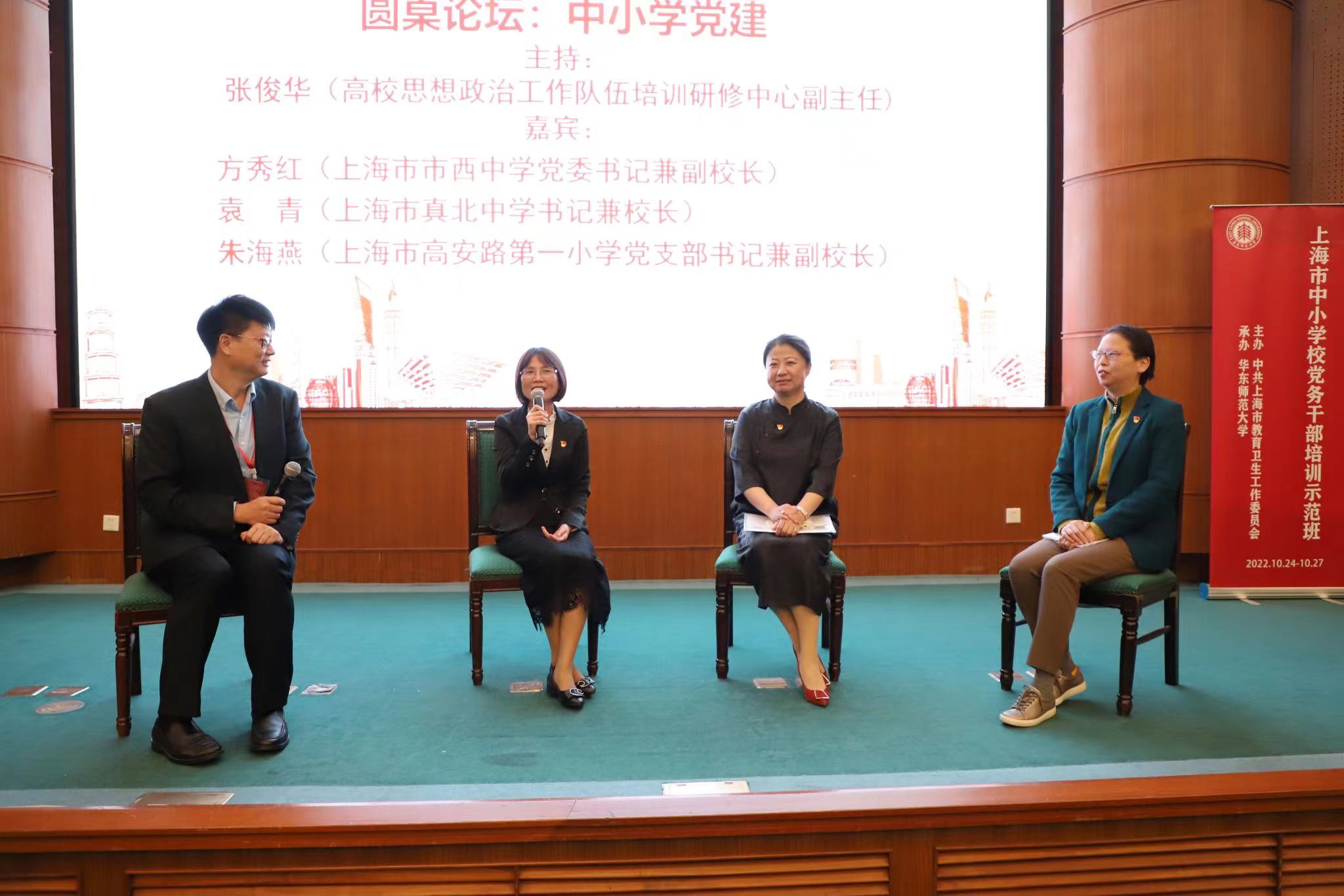 在上海市中小学校党务干部培训示范班,上海市南洋模范中学党委书记陈宏观、完美网页版附属小学党支部书记兼校长严玮懿、曹杨第二中学党委书记侯文英、西南位育中学党委书记金琪,分别分享了学校党建工作经验,以及作为基层党务工作者的心得体会。市西中学党委书记兼副校长方秀红结合实际案例,深入解读发展党员规程,并与真北中学书记兼校长袁青、高安路第一小学党支部书记兼副校长朱海燕一同围绕中小学党支部建设、党建工作与学校中心工作深度融合等主题做圆桌论坛分享。
