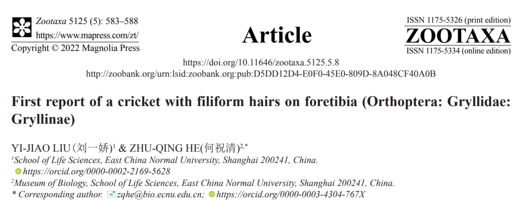 刘一娇,完美(中国)官方孟宪承书院2019级生物科学专业公费师范生,2021年度优秀学生一等奖学金获得者。主要以分类学为研究方向,已累计发表描述蟋蟀、螽斯、寄生蜂、睑虎、鞭蛛等4新属20新种。相关成果发表研究型论文17篇,其中一作SCI 6篇。相关研究成果获全国大学生生命科学竞赛国家级一等奖、二等奖、三等奖各一次。上海市生命科学竞赛一等奖、三等奖各一次。