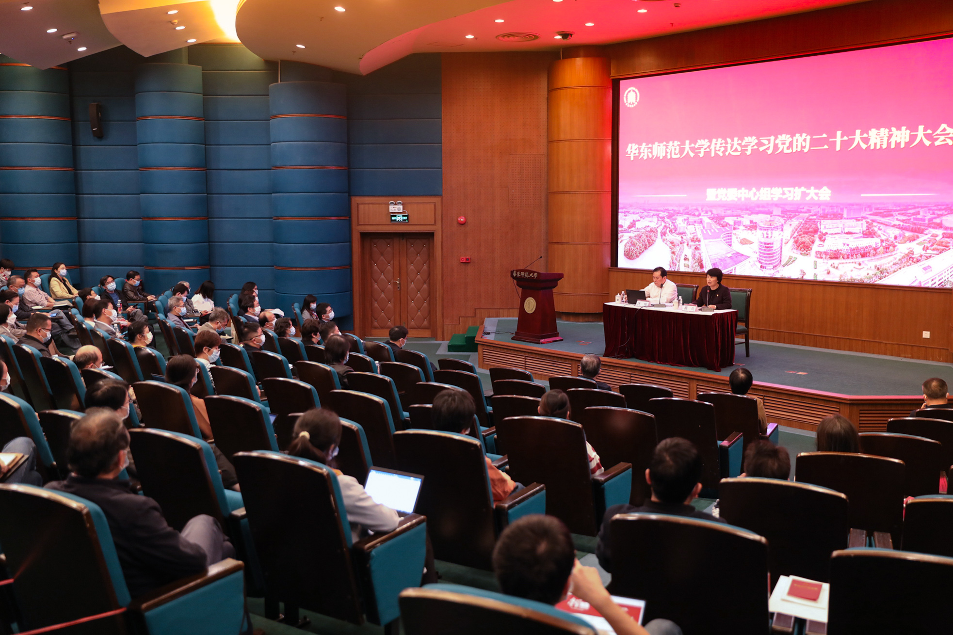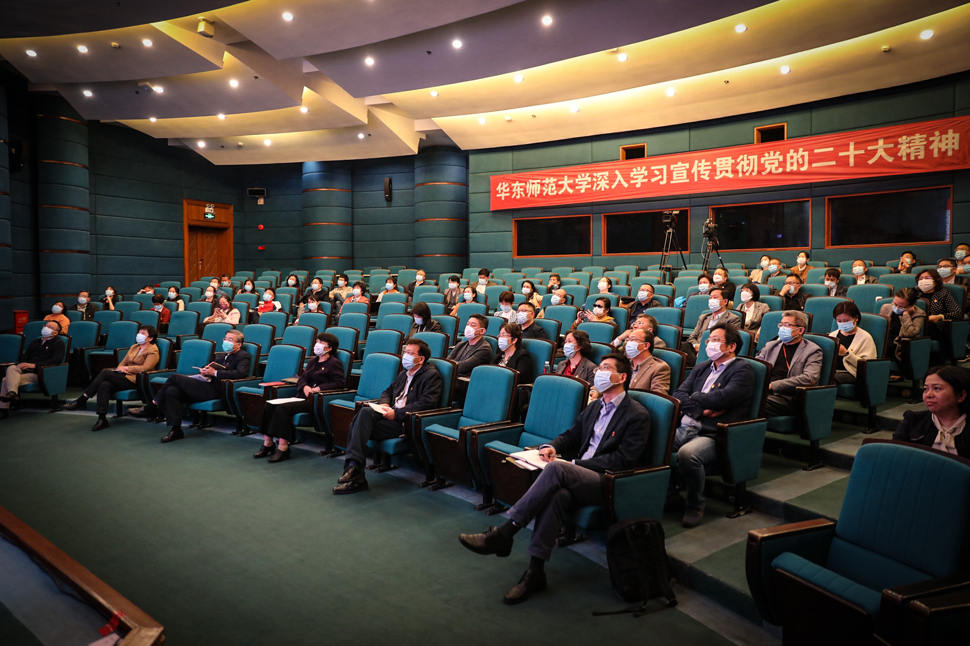 校领导、各单位党委(党总支)书记、管理服务部门主要负责人、工青妇负责人等在普陀校区参加线下学习。因常态化疫情防控要求,其他中层干部、机关各党支部支委在线上参加学习。本次会议同时作为校纪检干部学习贯彻党的二十大精神专题研讨班的重要课程之一,作为思政课教师集体备课会的主要报告之一。