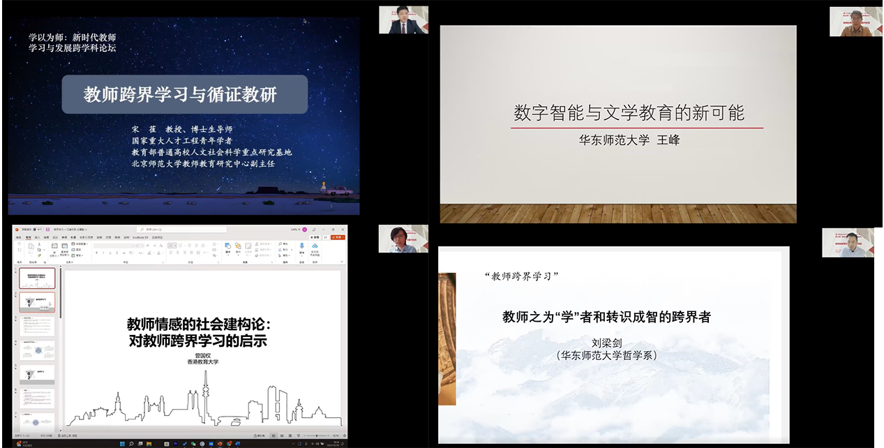 本次论坛分跨学科对话与专题研讨两阶段举行。第一阶段是跨学科对话,由程亮教授主持,来自不同学科的四位专家进行了主旨报告。北京师范大学教师教育研究中心副主任宋萑教授作了题为“教师跨界学习与循证教研”的报告,从循证教育学的理论视角出发对教师专业性进行了重新认识,探讨了循证教研的开展过程,认为循证教研可以借助边界物实现知识转化,推进跨界对话达成知识互动。完美网页版传播学院院长王峰教授作了题为“数字智能与文学教育的新可能”的报告,认为学者作为终身学习者,既要“法前王”,更要“法后王”,强调数字智能是多智能融合,跨学科需要教师收回原先的假设,主动发现和预判变化的方向。香港教育大学曾国权博士作了题为“教师情感的社会建构论:对教师跨界学习的启示”的报告,侧重从教师情感的社会建构出发,阐明情感之于教师跨界学习的重要性,并指出教师情感容易影响跨界学习的成效,未来需要深入研究跨界学习中教师情感的机制与作用。完美网页版哲学系系主任刘梁剑教授作了题为“教师之为‘学’者和转识成智的跨界者”的报告,提出“学”以成人是人的天职,“学”者需要学知识、强才干、做工夫。教师作为转识成智的跨界者,应通过知行,在世界之中成人,以教育的方式参赞天地化育,由此形成“开-心学习共同体”。