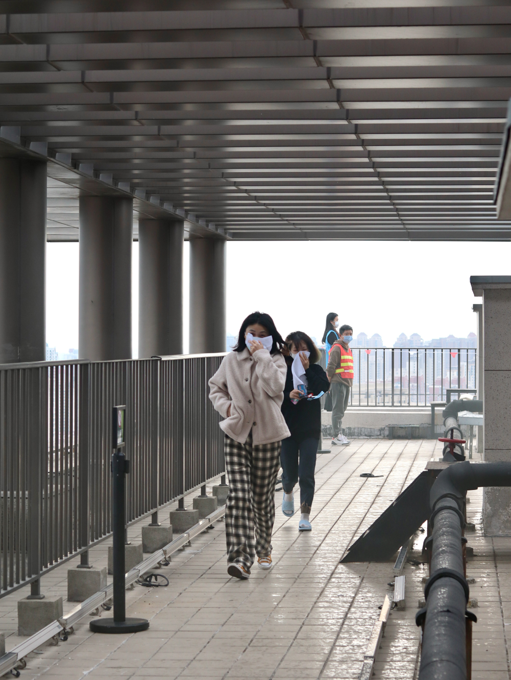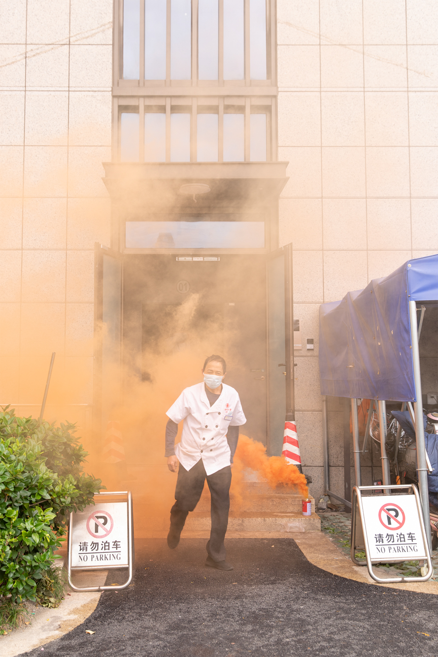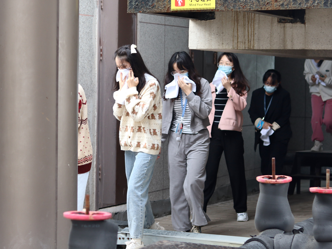 随后,赵健宣布119消防安全演练启动。根据部署,公寓楼22层设置一个模拟着火点。随着警铃响起,各楼层人员快速响应。在工作人员的引导下,同学们迅速寻找就近的逃生通道,捂住口鼻、弯腰俯身,疏散撤离。着火点以上楼层的学生迅速向天台疏散撤离,着火点以下楼层学生迅速向地面撤离。全体人员疏散快速、有序,达到演练效果。
