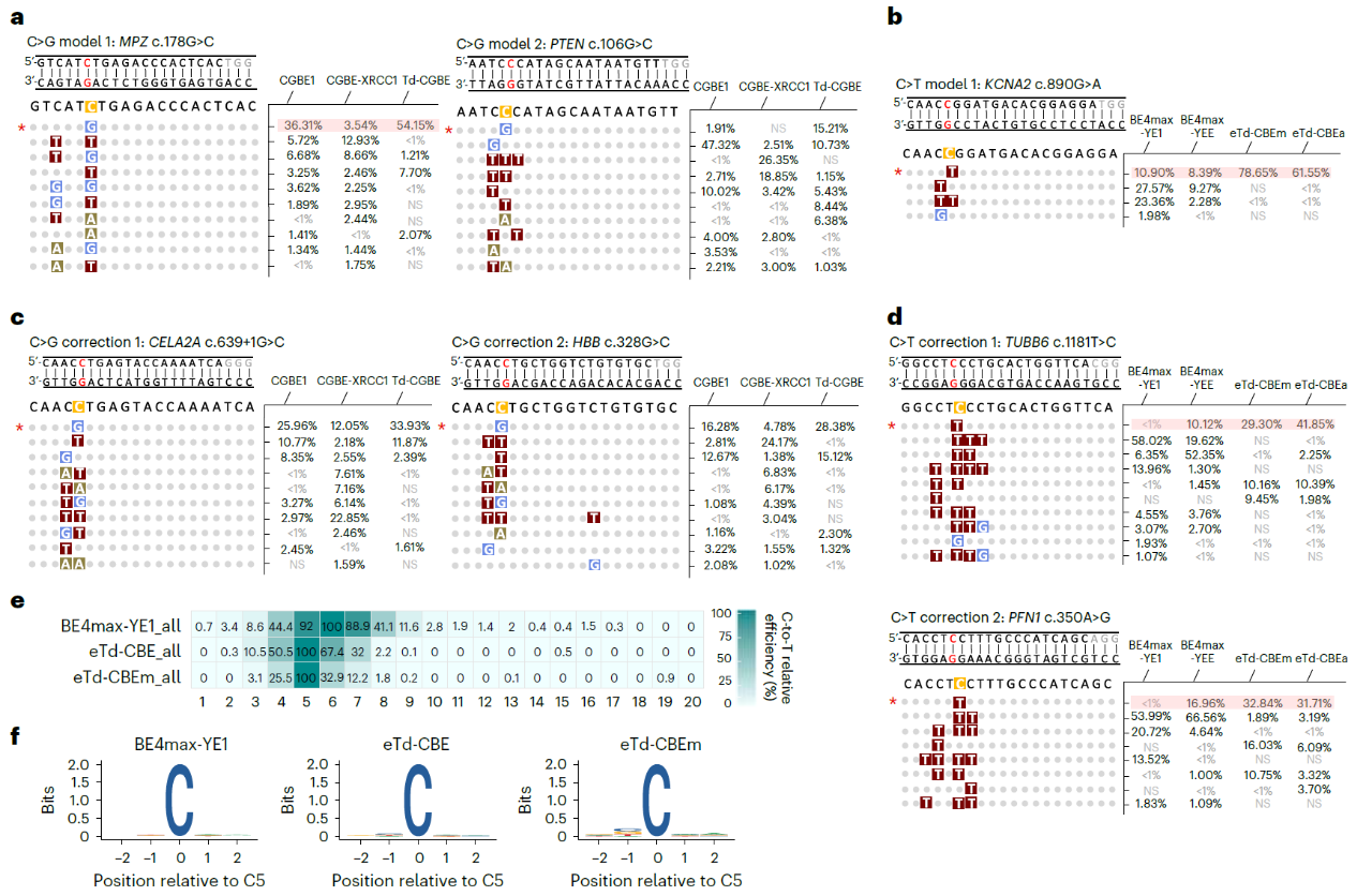 通过Cas9依赖性的脱靶位点、Cas9非依赖性脱靶的R-loop检测和项目组前期开发的最灵敏的Detect-seq以及RNA脱靶的转录组分析,令人兴奋的是,Td-CGBE/Td-CBEs变体几乎不引起随机的DNA和RNA脱靶编辑(图3),展示出了极高的应用安全性。此外,Td-CGBE在小鼠胚胎中展示出极高的体内编辑活性和精度。在所有的F0代小鼠中,Td-CGBE可以高效编辑靶位点的C5位碱基(20/21只),其中67%的小鼠产生C到G的编辑,最高效率达到84.9%,相对于APOBEC1来源的CGBE有更高的效率且诱导极低的indels。为进一步评估Td-CGBE/Td-CBEs变体基因治疗的潜能和其精准的特性,研究者评估了其在背景序列含有多个同源多聚胞嘧啶位点的致病单核苷酸变异(SNVs)的编辑情况,这些位点中需要纠正的胞苷处于sgRNA第五位且处于多个连续胞苷中。发现Td-CGBE/Td-CBEs能精准编辑sgRNA第五位的胞苷并产生所需的C-to-G/T转换,相对于传统CGBE/CBEs展现出更精准、高效地构建或纠正致病SNVs位点的能力(图4)。最后,为了无偏见地分析eTd-CBEs的精准编辑特性,该研究采用含有8954条sgRNA与靶点配对的文库进行编辑窗口的分析,发现eTd-CBEm非常精准且无序列偏好地主要编辑C5位碱基,证明其广泛地精准编辑特性(图4)。由于其无编辑序列偏好,因此将来还可以与识别不同PAM的Cas蛋白变体融合,进一步扩大靶向范围。