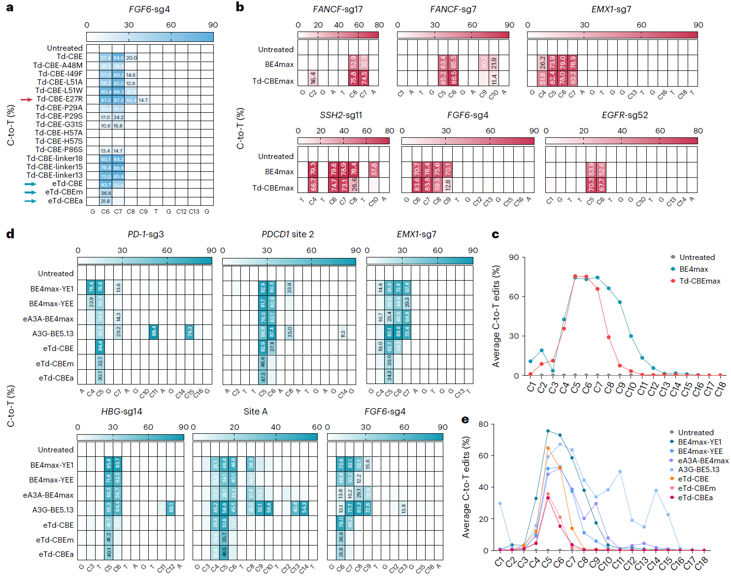 Td-CGBE高精确度的特性为进一步开发精准的C到T的碱基编辑器奠定基础,项目组通过对TadA-8e结构中可能与底物相互作用的关键区段重新改造、linker序列以及UGI串联等多轮优化获得了一系列Td-CBEs,发现其依然表现为完全消除腺嘌呤编辑的特性,其中TadA-8e引入关键突变E27R获得的Td-CBEmax,在13个靶点测试后发现,其保留高效的C到T编辑活性,产生与BE4max相似的编辑活性(57.7%-94.9%),但编辑窗口显著缩小到sgRNA的5-7位,而且产生显著降低的indels频率。为了解决传统CBE的精准性问题,该研究发现在Td-CBE的基础上去除linker序列并在TadA-8e-N46L的基础上引入P29A(eTd-CBEa)或A48M(eTd-CBEm)可保留较高的C到T编辑活性,并且显著缩小编辑窗口到sgRNA的第5或第6位,与基于APOBEC1来源的窄窗口BE4max-YEE相比,eTd-CBEs变体的精确度最高提升了131.4倍,且仅诱导背景水平的indels事件(图2)。