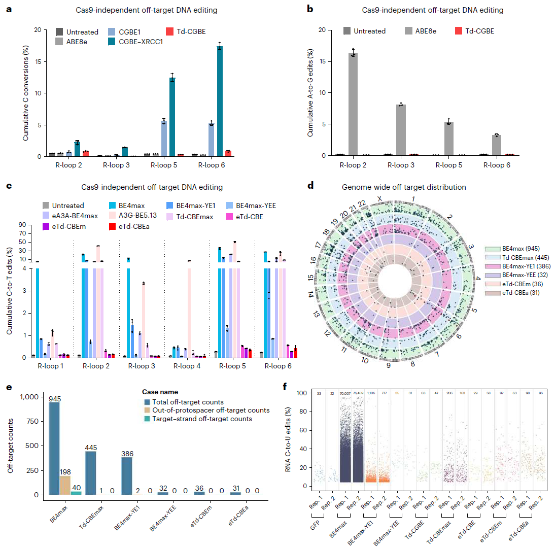 总的来说,该研究创造性地通过蛋白改造,将以腺嘌呤为底物的脱氨酶TadA-8e改造成为仅以胞嘧啶为底物的非天然的胞嘧啶脱氨酶,并构建了第一个不依赖AID/APOBEC脱氨酶家族的新型CGBE/CBE系列碱基编辑器-Td-CGBE/Td-CBEs,表现出与BE4max系列编辑器相当的编辑效率,而编辑窗口更加精准,脱靶率极低(接近背景水平)。该研究一方面为深入理解TadA-8e的结构和工作原理从而开发新的碱基编辑技术提供了新思路,更为重要的是有望极大提高将来临床应用的安全性。碱基编辑器的优化升级及安全性的完善为人类遗传疾病的基因治疗带来希望。