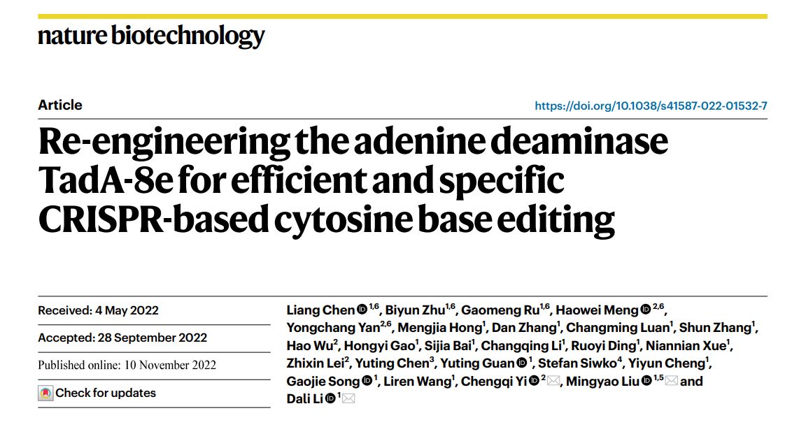 研究成果以题为Re-engineering the adenine deaminase TadA-8e for efficient and specific CRISPR-based cytosine base editing的研究论文在Nature Biotechnology杂志上发表。