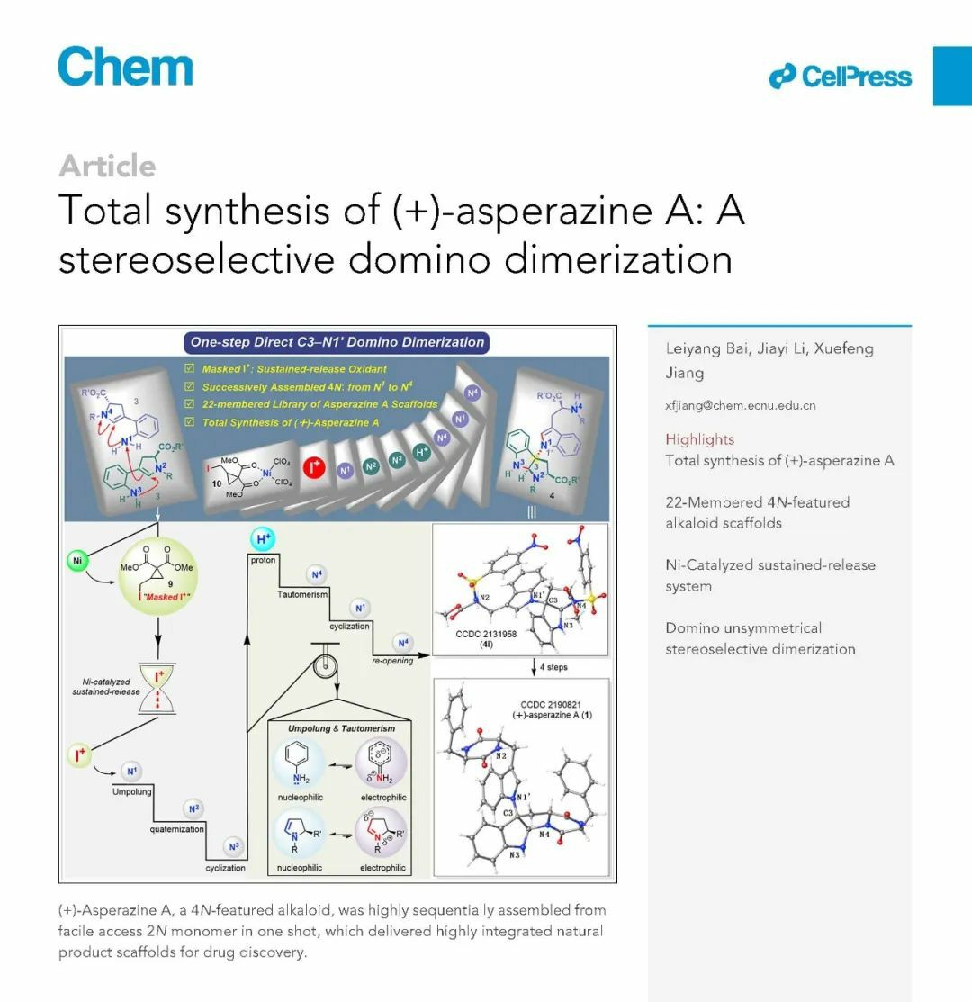 近两年,他以第一作者身份连续发表两篇全合成工作成果,其中 Total Synthesis of (−)-Calycanthine via Iron-Catalyzed Stereoselective Oxidative Dimerization 于2021年12月6日发表在《美国化学会志》(J. Am. Chem. Soc),Total Synthesis of (+)-Asperazine A: A Stereoselective Domino Dimerization 于2022年11月10日发表在《化学》(Chem),影响因子分别为16.4和25.8。这两项成果建立了四氮二聚生物碱一步构建骨架的新方法,令复杂天然产物全合成成为如同方法学一样快速获得活性分子库的高效方法,为药物发现奠定了“可以直达的”合成基础。
