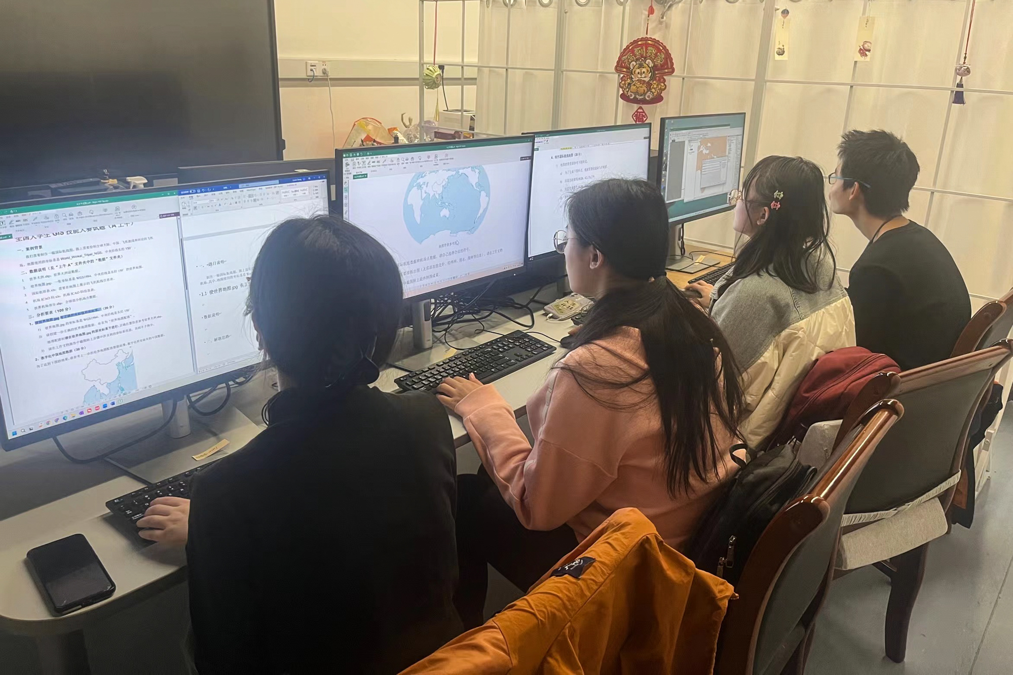 比赛前期,四名参赛队员在两轮激烈的校内选拔赛中脱颖而出,学院组成了由指导老师、研究生、往届参赛队员组成的强大指导团队,以题代训,通过历届大赛原题对比赛上午下午考察内容进行针对性训练。经过近两个月的集中训练,四位来自不同班级的同学在并肩作战中逐步建立起了默契。杨宗翰曾在暑假期间参与地理信息技术与应用技能大赛并获三等奖,逻辑思路清晰,担任队内主操作手。祁宁宁对于工具操作掌握较好,在做题遇到瓶颈时能够快速提供解决方案,在团队中承担操作与流程图补充任务,与主操作手分工处理题目数据。赵博旸善于制图,并在训练期间逐渐形成了自己的制图模式,在比赛中承担制图任务。陈秀静对理论知识掌握扎实,做事细致稳重,承担了文档撰写任务。四位同学在比赛中合理分工、配合默契,在高压高强度的竞赛环境下,面对瓶颈与难题不言弃,最终顺利完成比赛答题。