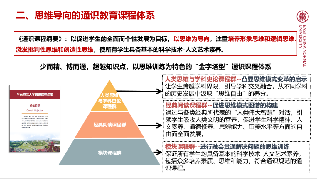 对下一阶段通识教育工作,钱旭红提出几点要求:一是系统开展通识教育的研究和顶层设计,深刻理解马克思所强调的“人的全面而自由发展”。所谓“全面”,在思维层面即思维各要素的全面;“自由”即给学生选择性的自由。二是要以思维为导向,切实转变教学方式方法,将至少四种思维能力的培养,即逻辑思维、形象思维、批判性思维、创造性思维落到实处。三是构建更开放的通识教育生态,将校园内外、第一和第二课堂、动脑和动手相结合,使通识教育真正对学生产生深远影响。