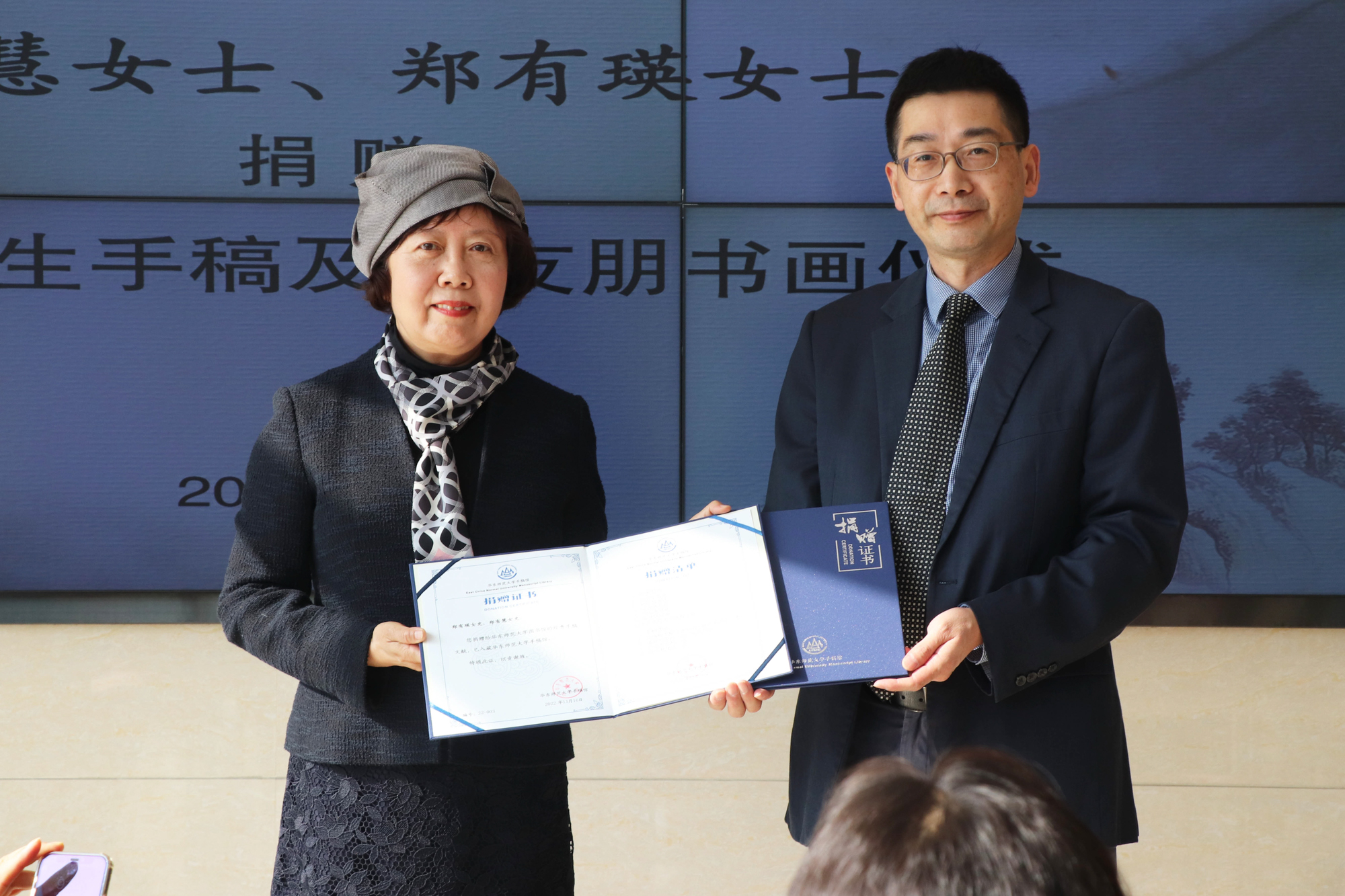 副校长顾红亮向郑有慧校友颁发了捐赠证书。顾红亮表示,郑有慧校友、郑有瑛女士所捐赠的郑逸梅先生的手稿以及所收藏的文化名家的手稿、书画等,都是值得继承、弘扬,并进而实现创造性转化和创新性发展的优秀传统文化,我们一定要管好、用好,让这些文化珍品化为以教育强国、建教育强国的精神动力和智慧源泉。