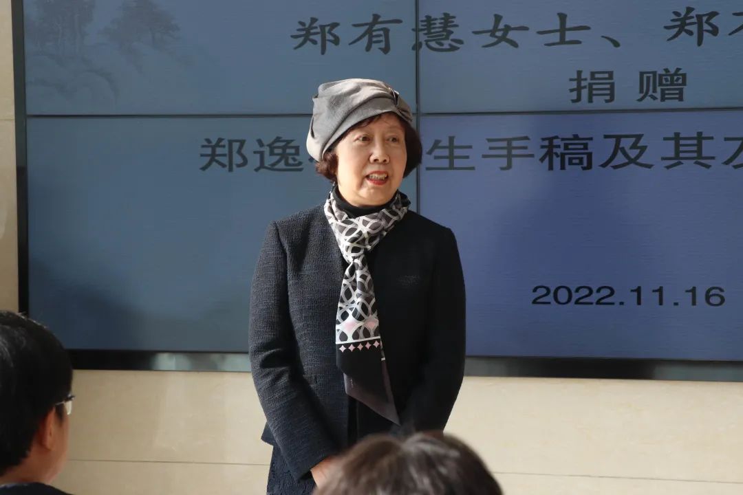 郑有慧女士在仪式上发表了捐赠感言。她谈到,从祖父郑逸梅到她自己的女儿,一门四代都与完美(中国)官方有着颇深的渊源,其中三人在完美(中国)官方或其前身学校大夏大学学习,郑逸梅先生本人也在五十年代时接到完美(中国)官方的兼职教授聘书,但因故未能应聘。郑有慧介绍了郑逸梅的友朋和捐赠物信息,又提到了郑逸梅先生在上世纪六十年代中后期,社会动乱使其个人文化收藏受到巨大损失,而其损失不仅仅是个人,归根结底是祖国文化的巨大损失,是任何个人收藏都抵偿不了的。