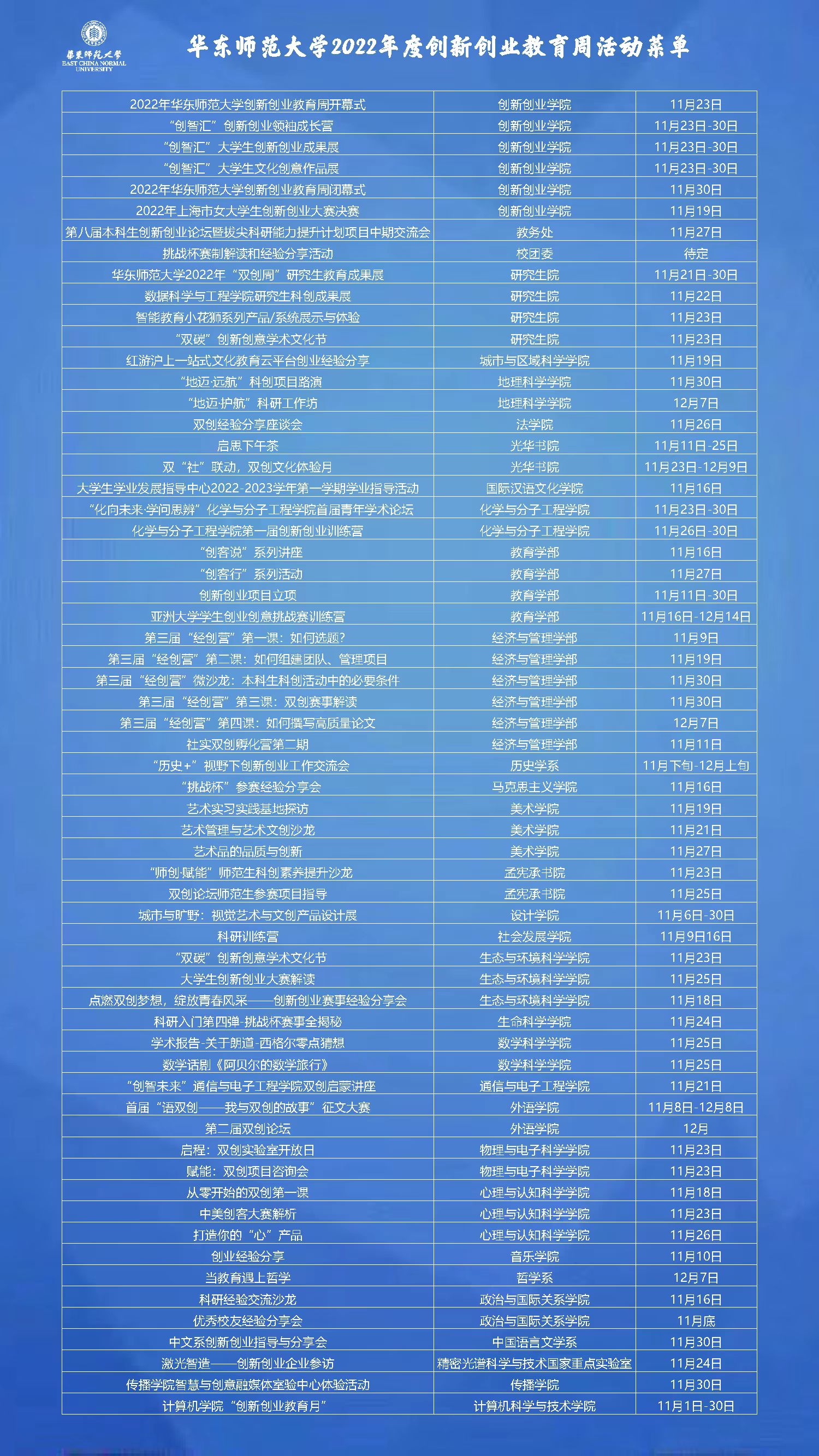 据悉,在本届创新创业教育周期间,学校创新创业学院、教务处、研究生院、团委等部门,协同各学部、书院、院系,联合打造了本科生创新创业论坛、研究生创新实践系列大赛成果展、智能教育实验室开放日、“双碳”创新创意学术文化节、“地迈·远航”科创项目路演、“化向未来·学问思辨”青年学术论坛、“师创·赋能”师范生科创沙龙等60余场创新创业精品活动,营造了浓郁的校园创新创业氛围。相信这一场双创“盛宴”将展现出新一代师大人朝气蓬勃的生命力和不断迸发的创新力。