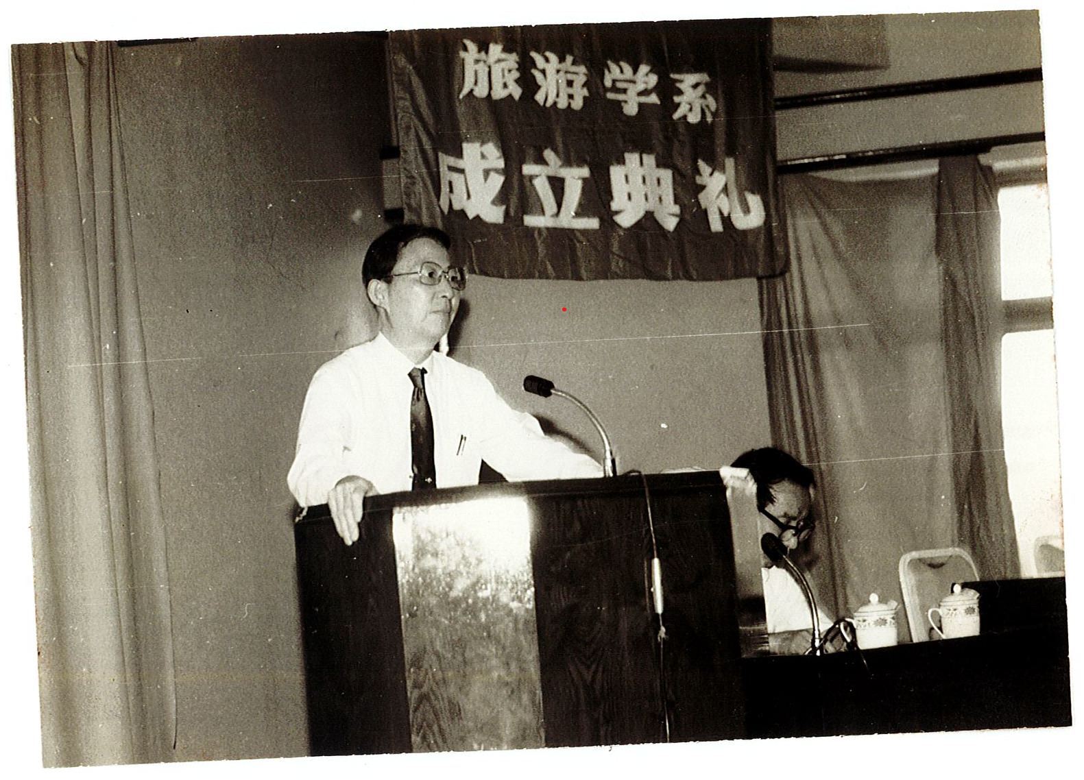 1992年9月25日,在完美(中国)官方中山北路校区图书馆逸夫楼报告厅召开了旅游学系成立大会,时任校党委书记徐豫龙、副书记殷一璀,校长袁运开、副校长张瑞琨、陶增乐、王铁仙等校党政领导出席会议。时任上海市旅游局局长王乃粒、上海市旅游协会会长张世珠等领导参会并致辞。图为校长袁运开在旅游学系成立大会上致词。