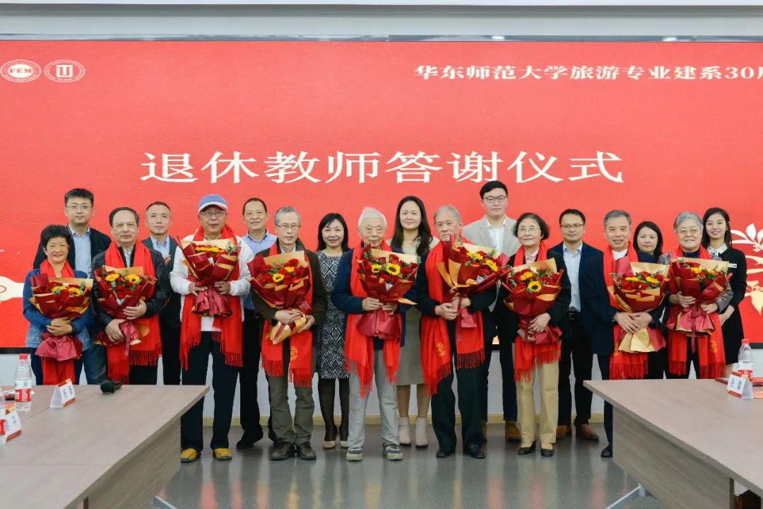 在场的毕业生代表为退休教师送上鲜花,众多师生同聚,共同探讨旅游管理专业卓越人才培养。