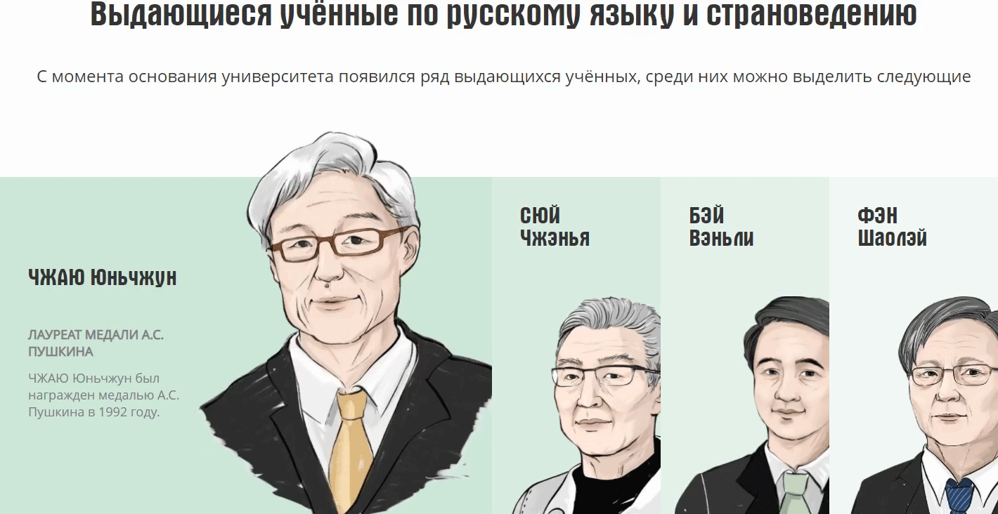 多年来,涌现出一批以赵云中(获俄罗斯普希金奖章),徐振亚(获俄罗斯高尔基奖、中国俄语教育杰出贡献奖),冯绍雷(获瓦尔代贡献奖),贝文力(两度获颁白俄罗斯教育部 “中白教育合作杰出贡献奖”),朱逸森、曹国维(获中国俄语教育杰出贡献奖)为代表的研究俄罗斯语言、文化、政治、经济、外交的专家学者。为展示学者风采,俄文官网为杰出贡献的学者设计了一组手绘人物肖像,在网站主页进行动态呈现。