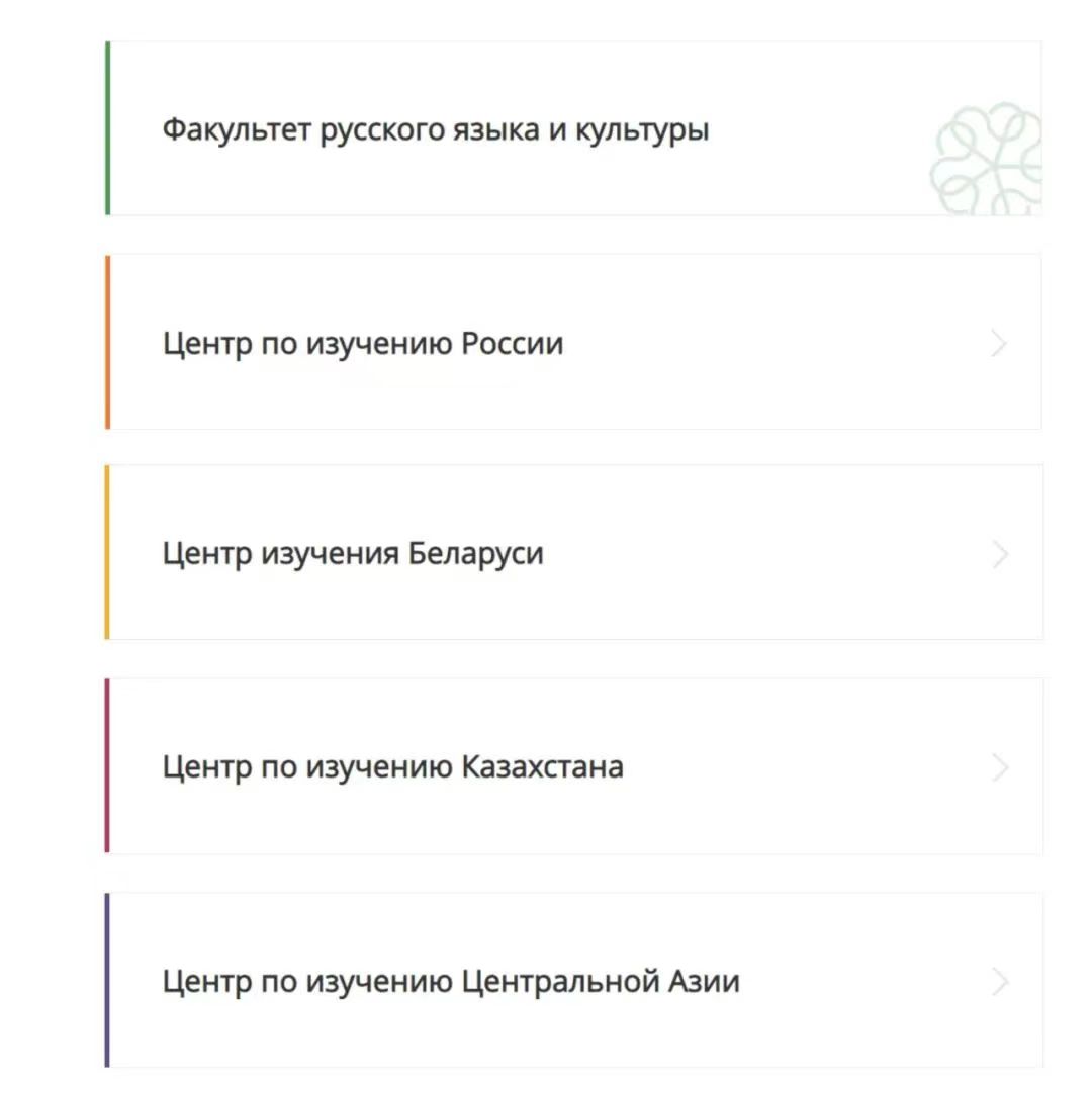 主要有莫斯科罗曼罗索夫国立大学、莫斯科国立师范大学、俄罗斯高等经济研究大学等30多所俄罗斯高校;白俄罗斯国立大学、白俄罗斯国立经济大学、白俄罗斯国立音乐学院等20多所白俄罗斯高校;乌克兰国立大学、乌克兰国立师范大学等5所乌克兰高校;在中亚地区,主要有哈萨克斯坦阿里·法拉比国立大学、纳扎尔巴耶夫大学、塔吉克斯坦国立大学、奥什国立大学、塔什干国立师范大学等10所高校。
