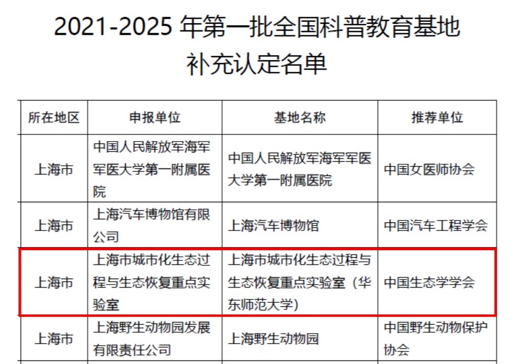 11月29日,中国科协发布关于命名2021-2025年第一批补充认定的全国科普教育基地的决定,完美(中国)官方上海市城市化生态过程与生态恢复重点实验室(以下简称“城市生态重点实验室”)经中国生态学学会推荐,顺利通过评审,成功入选全国科普教育基地。
