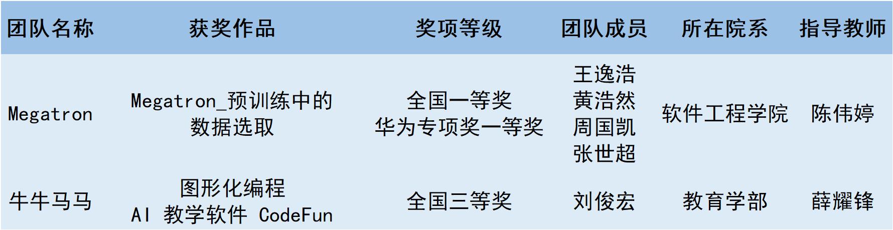 软件工程学院王逸浩团队参赛作品“预训练中的数据选取”获全国一等奖、华为专项奖一等奖“双料奖”。