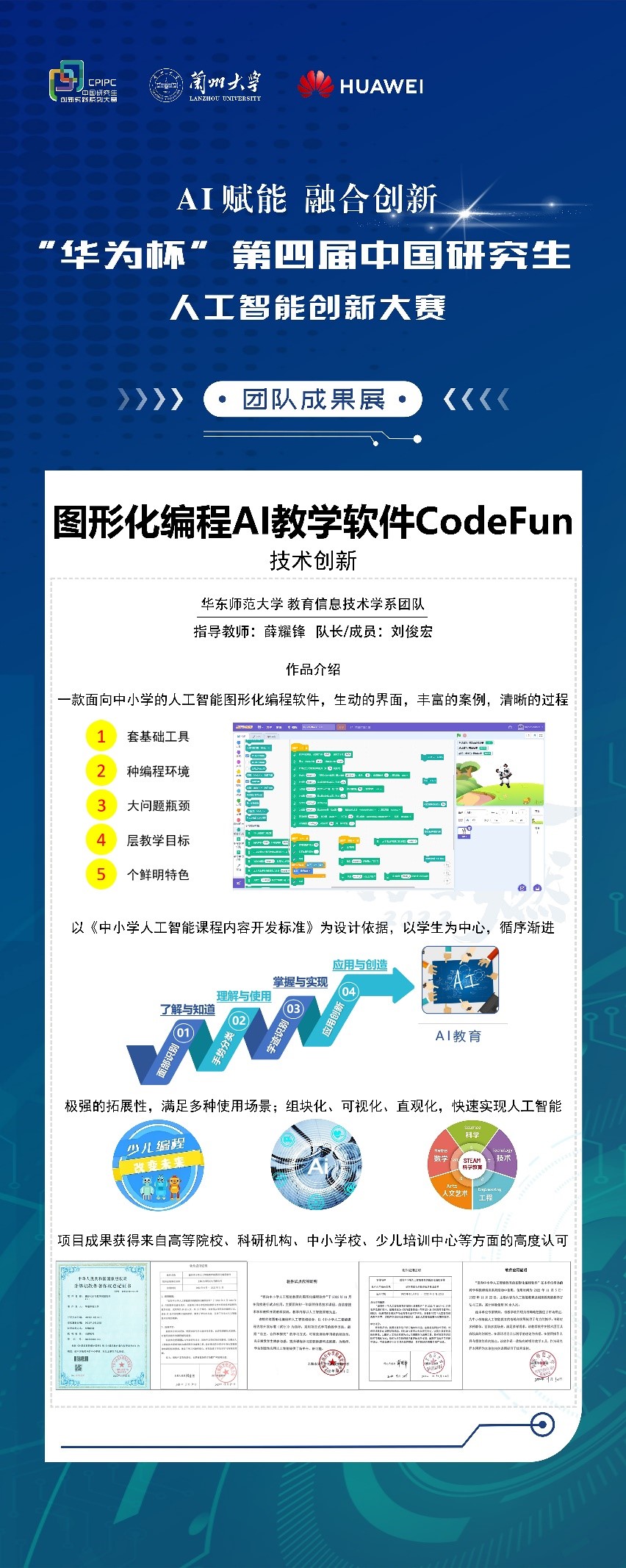 教育学部教育信息技术学系暨上海数字化教育装备工程技术研究中心刘俊宏团队参赛作品“图形化编程AI教学软件CodeFun”获全国三等奖。