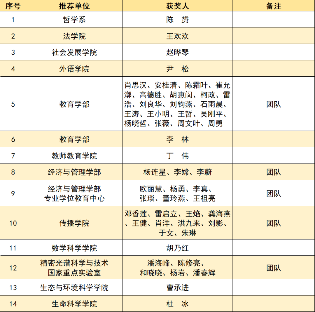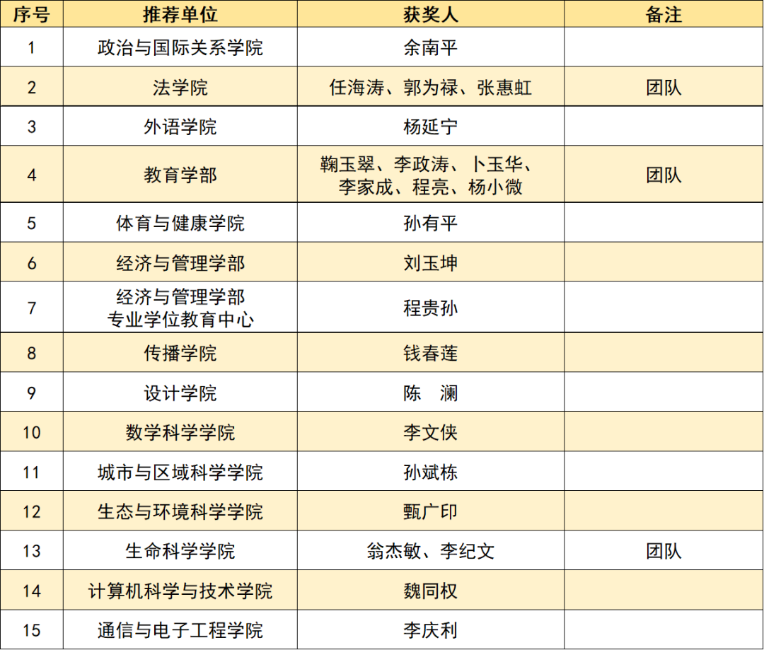 健全研究生教育荣誉激励机制,评选15个优秀研究生导师奖(含团队)、14个优秀研究生教学奖(含团队)、10个优秀研究生教育管理工作者奖(含团队),选树典型,示范引领,汇聚合力,调动教育教学一线教师投身研究生人才培养工作的积极性和创造力,不断提高研究生教育的课程质量、教学水平、指导能力和管理水平,推进研究生教育高质量创新发展,培育高层次卓越人才。