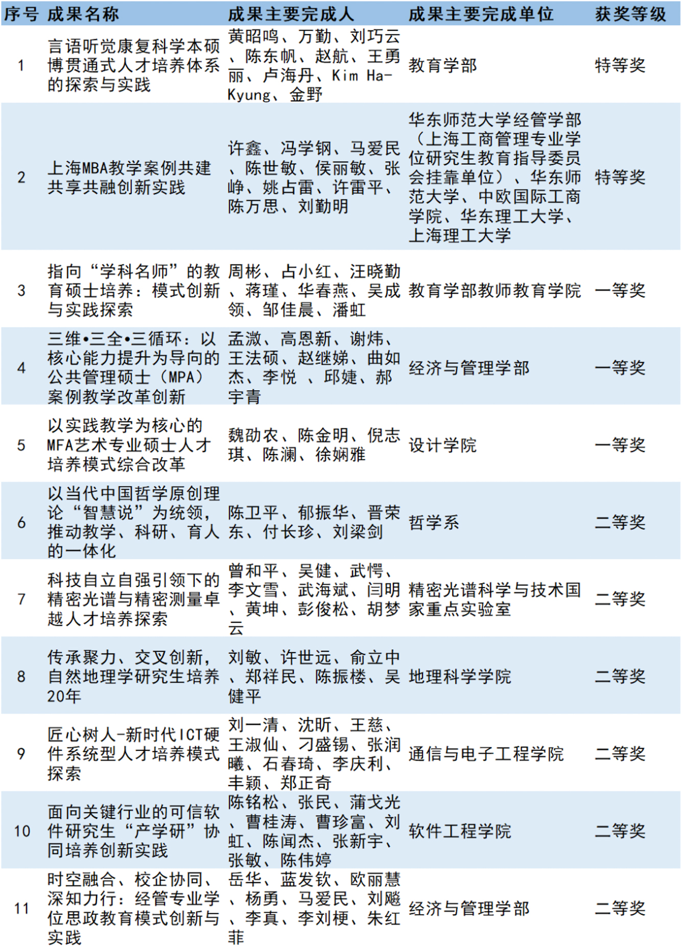 持续优化拔尖创新人才培养新模式,推动研究生教育成果取得新突破。11项研究生教育成果获上海市优秀教学成果奖,其中:特等奖2项、一等奖3项、二等奖6项。5项研究生教育成果推荐申报国家级教学成果奖。