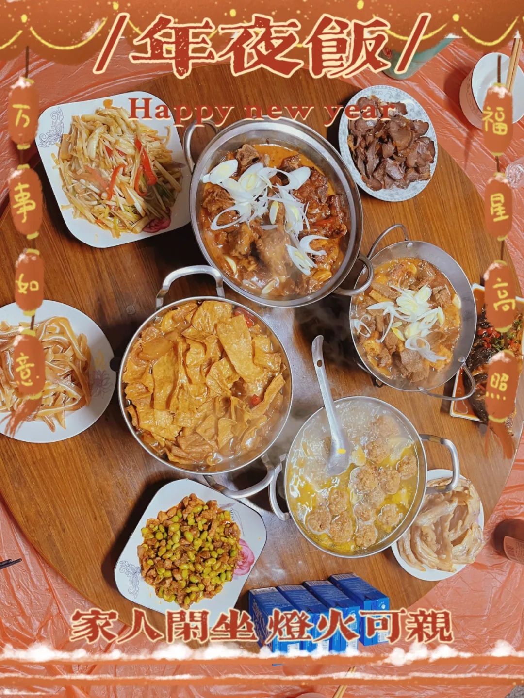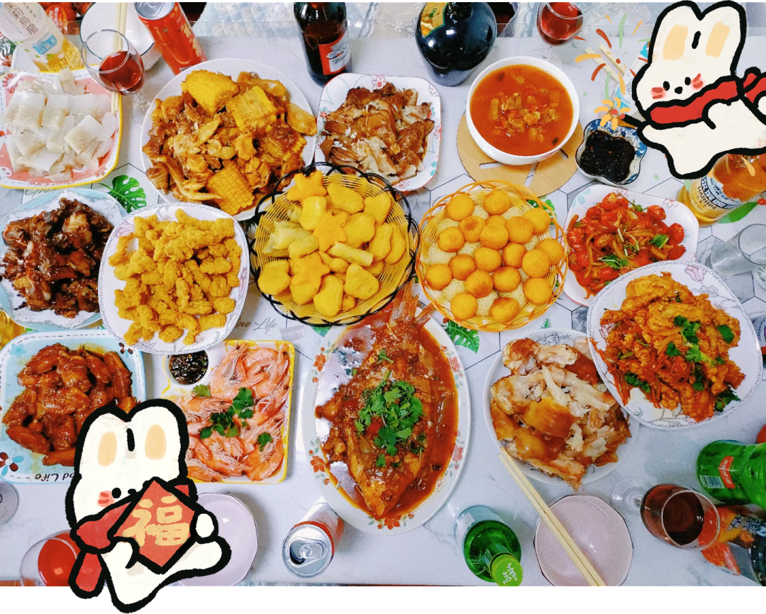 除夕夜,家家举宴、长幼咸集,年夜饭也是合家欢。年夜饭的仪式感就在这七碟八碗和与家人团圆围坐之中。看完了各地的年夜饭,再祝各位老师同学新年快乐,阖家幸福,平安顺遂!