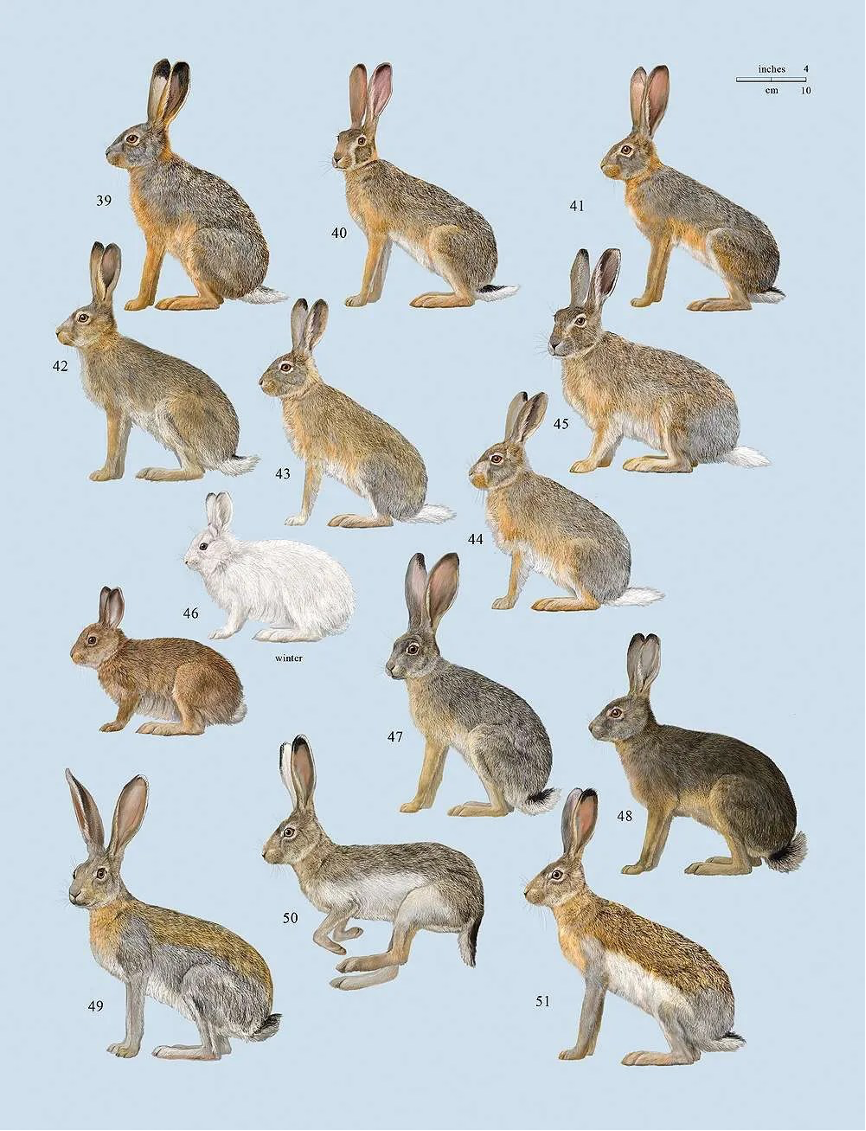 此外,还有和欧亚大陆高纬度山地分布的雪兔一样,也会在冬天变装的、分布在北美北部的白靴兔(Lepus americanus)Snowshoe hare,你没看错,它的英文名对应的真的是 “雪鞋”。而它的学名中种加词americanus,表明它们正是美洲大陆兔子的代表。