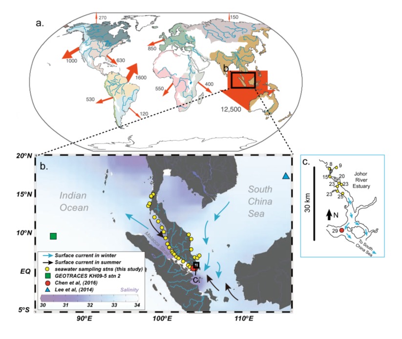 亚洲东部和南部是世界上河流入海沉积物通量最大的区域,其中东南亚地区多半岛与岛屿,海岸线长,且由于降雨量高、地形坡降大,单位面积的沉积物产出量大,所以是进行本研究实验部分采样的合适区域。研究团队分析了马来半岛周围多个站位的海水同位素数据,发现海水铅同位素组成并不能用河流与海洋两个端元的混和来解释。基于模型的计算结果则发现河流输入颗粒物与海水的铅交换可以很好地解释马来半岛周围海水的铅同位素异常。模型研究进一步表明,颗粒态-溶解态交换导致的由颗粒物向海水转移的铅元素净通量会随着海水浓度升高而降低。由于人类活动的影响(如含铅汽油的使用),当今许多地区表层海水的铅浓度较高,陆源颗粒物可能会成为海水铅的汇,但是对于人新世之前的海洋,由于海水铅浓度较低,颗粒态-溶解态交换的净效果使得陆源颗粒物成为重要的海水铅源。