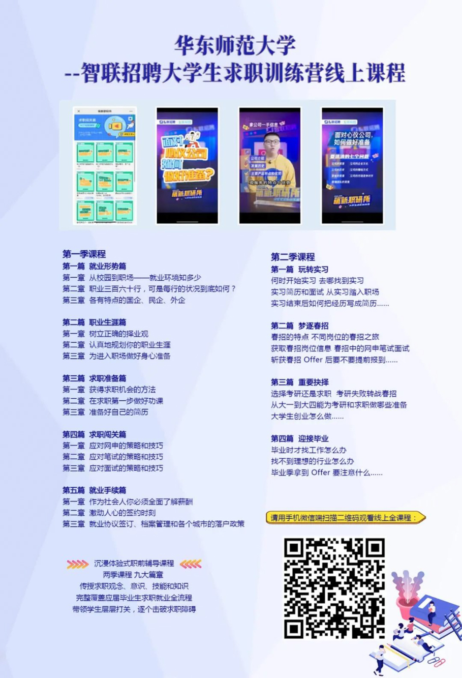课程内容:《就业形势》《职业生涯》《求职准备》《求职闯关》《就业手续》《玩转实习》《逐梦春招》等;
