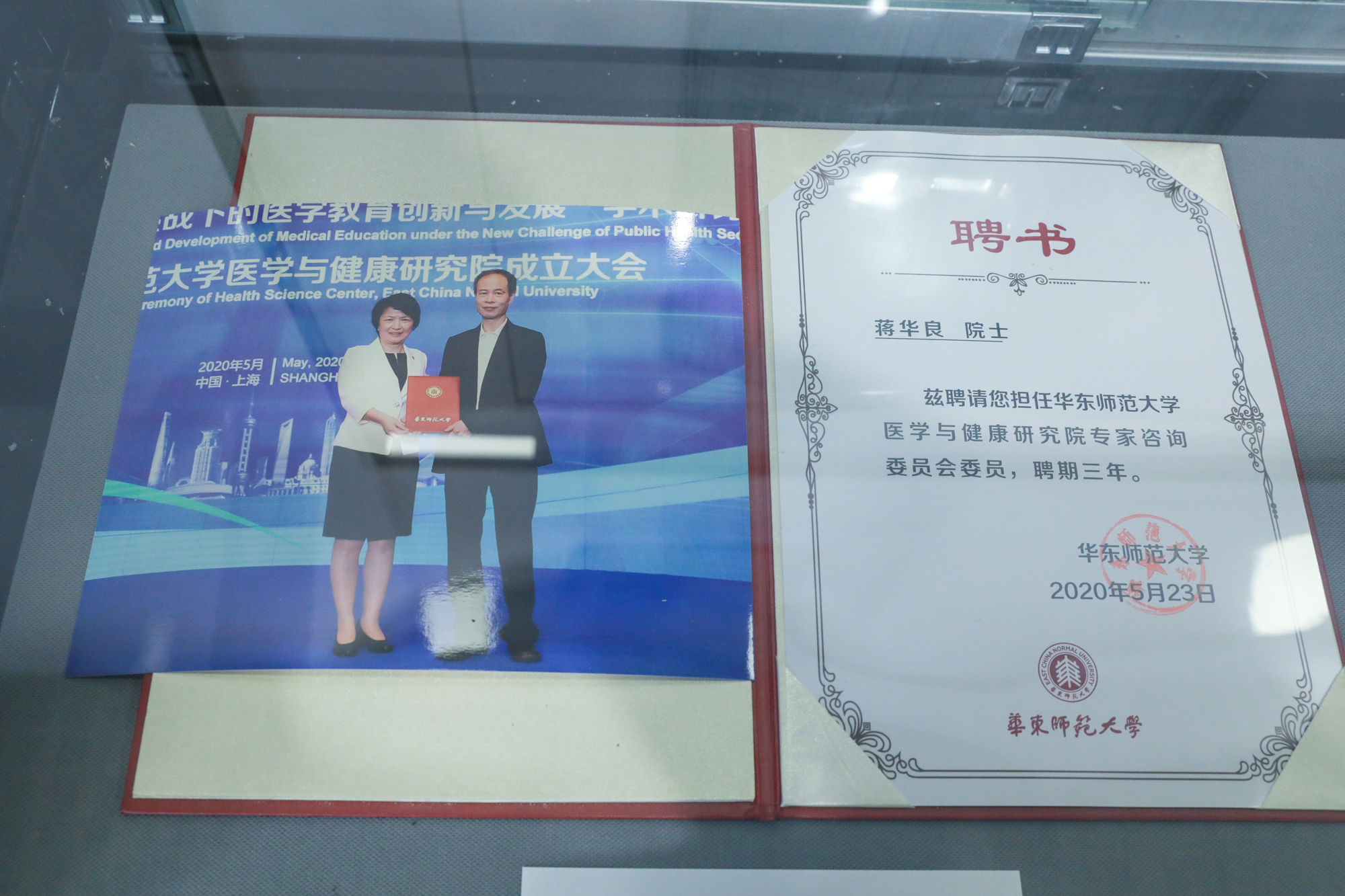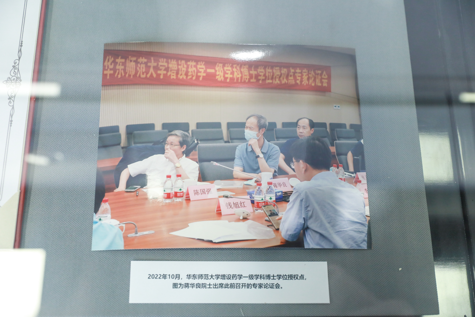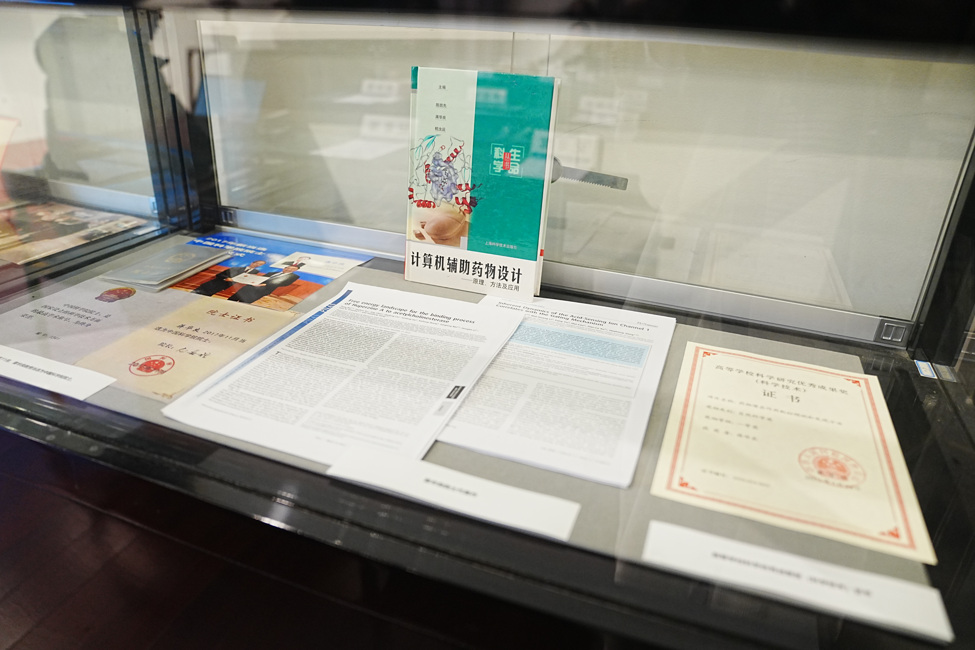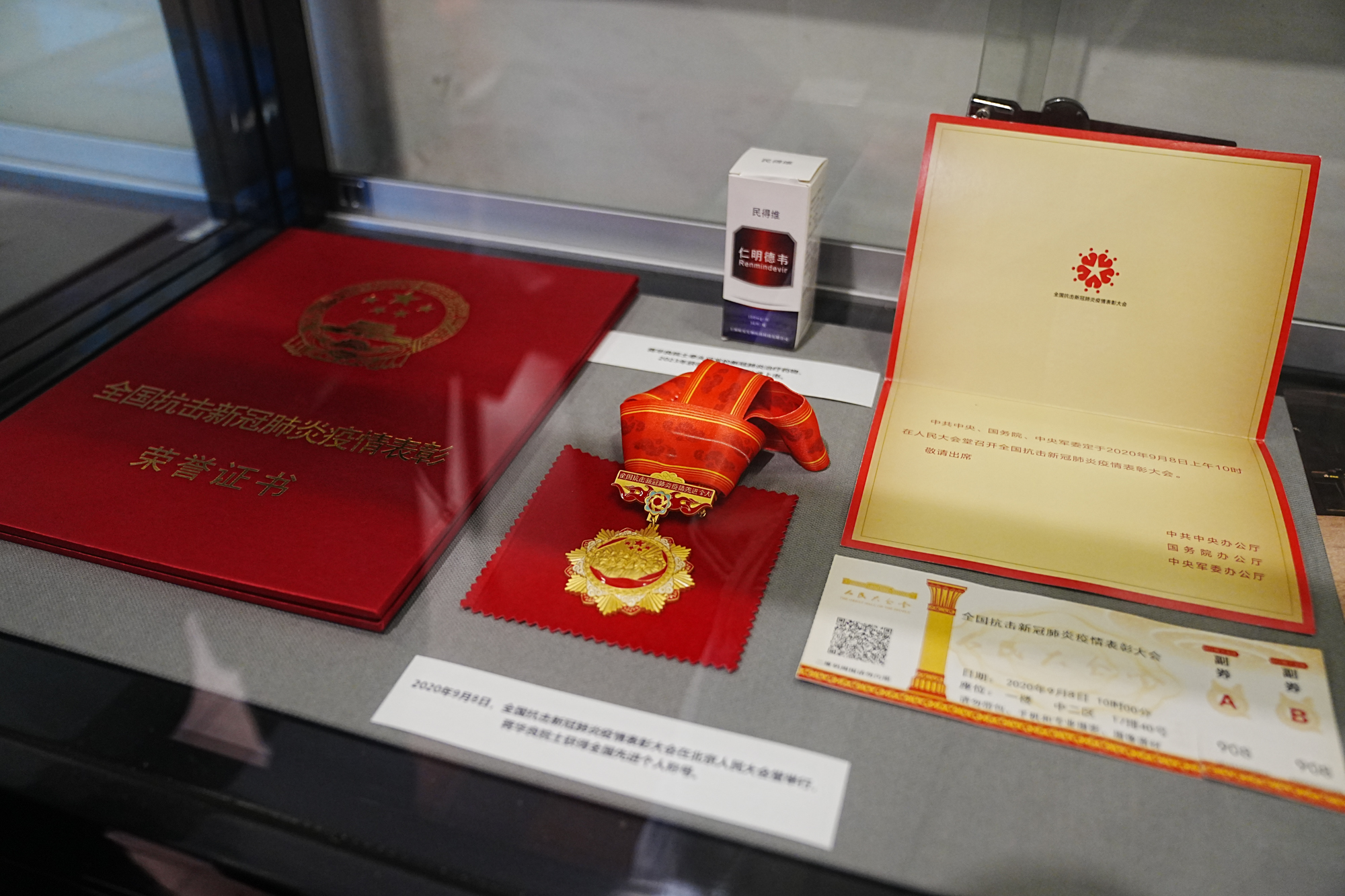 在蒋华良校友去世的这49天里,他和合作者共同创新攻关的抗新冠口服药“民得维”(VV116)新获国家药监局批准上市,这次也作为实物档案呈现。一同展出的还有他获颁的“全国抗击新冠肺炎疫情先进个人”奖章等三十余件个人实物档案。