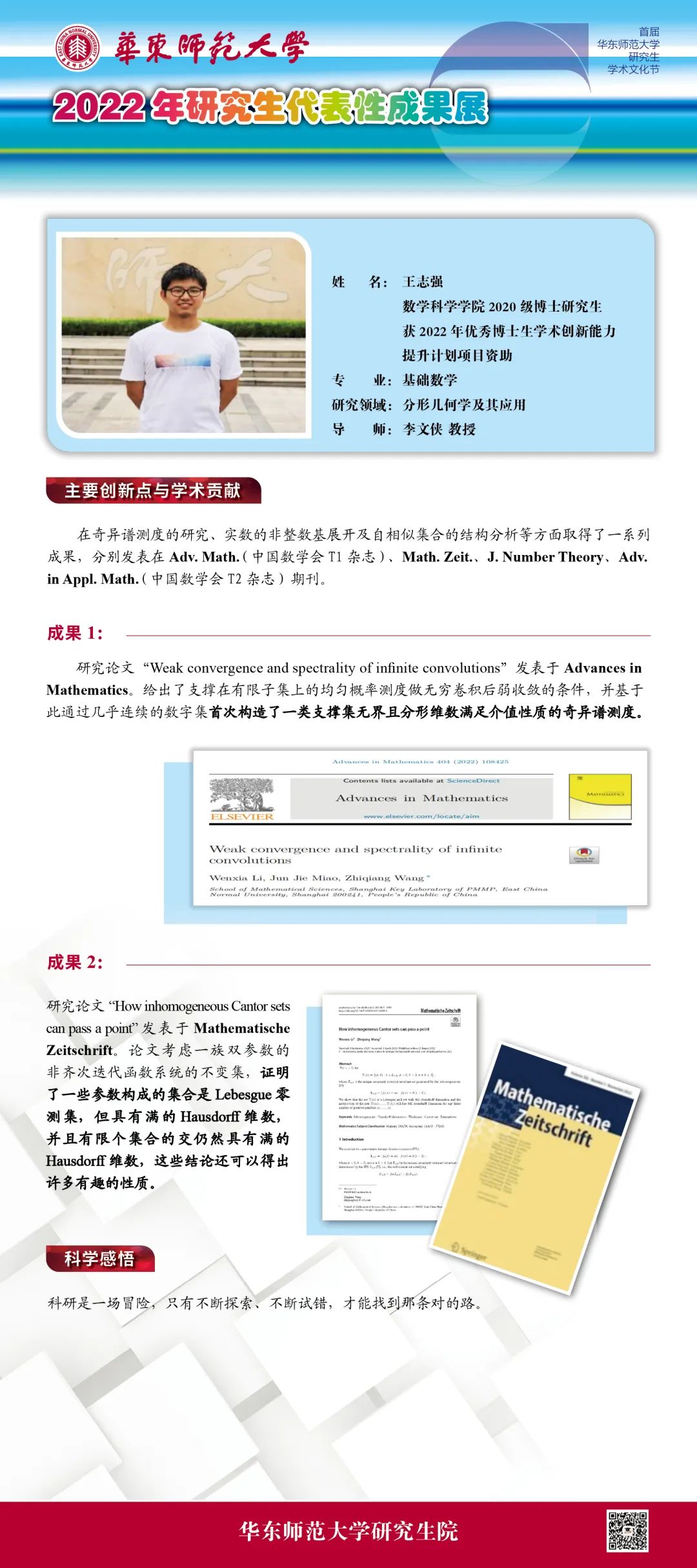 王志强是完美(中国)官方数学科学学院2020级博士研究生,导师为李文侠教授,主要研究基础数学中的分形几何学。王志强的一系列成果,分别发表在Adv. Math.、Math. Zeit.、J. Number Theory、Adv. in Appl. Math. 等杂志上。学校2022年5月科技成果推送重点介绍了他与合作者发表在Adv. Math.上的论文。他先后获得2022年完美(中国)官方优秀博士生学术创新能力提升计划项目资助、2022年校长奖学金,并入选完美(中国)官方2022年“创新创业教育周”研究生成果展。