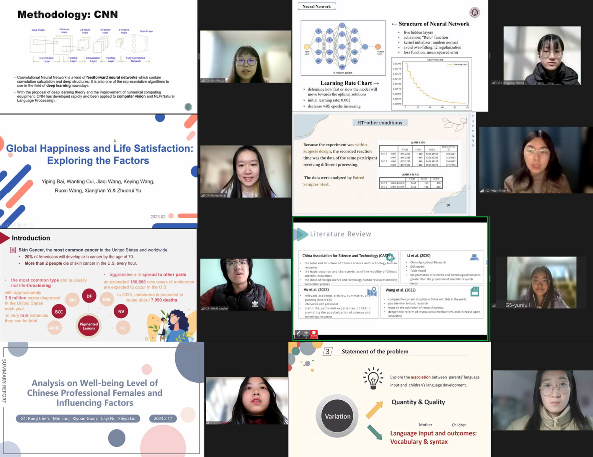 2月16日、17日,两个班共八组学生结合专业特点、项目所学,着眼社会、科学领域的实际问题,进行了自选题的汇报展示,将科研理论及方法应用于实践。汇报内容精彩多样,将课题的研究价值、研究方法和预期结果进行展示。科研论文班的同学展示的主题包含医学图像识别、不同国家幸福指数研究、科研能力与投资关系研究等,采用了多样的计算机语言、机器学习模型对数据进行分析处理和可视化;自然社科班的同学则选择了职业女性与儿童语言能力发展的课题进行研究,运用了定性研究、社会研究、定量分析等不同的研究方法。Toe、Cai两位教授就选题的创新性、研究方法的适用性、汇报呈现的效果进行点评,对课题研究提出了优化建议。