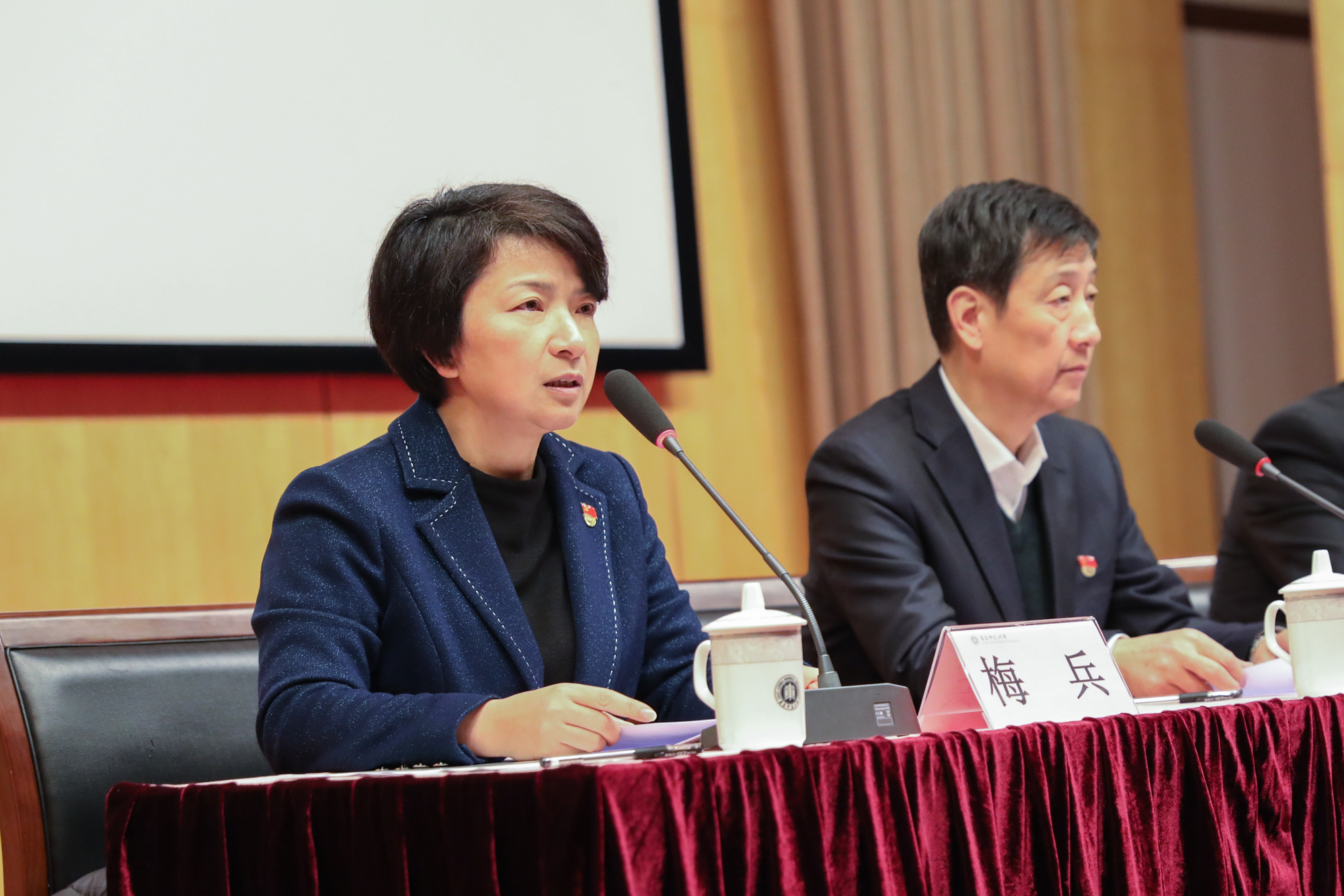 校党委书记梅兵通报校领导班子民主生活会情况并总结学校主题教育开展情况