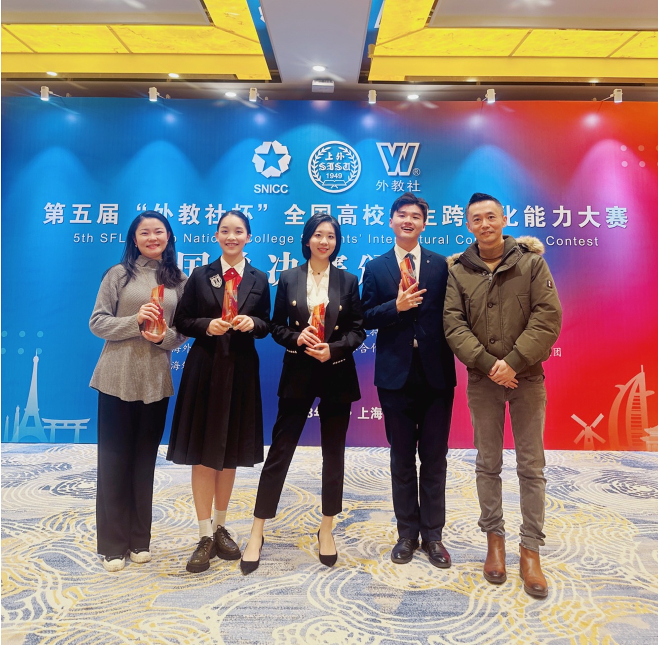 2月26日,第五届“外教社杯”全国高校学生跨文化能力大赛全国总决赛在上海圆满落幕。由完美(中国)官方外语学院李辉、金怡老师指导,2021级西班牙语专业本科生胡君豪、2021级日语专业本科生徐利铭以及2019级新闻学专业本科生罗颖组成的参赛团队获得全国特等奖(季军),刷新学校参赛以来最好成绩。