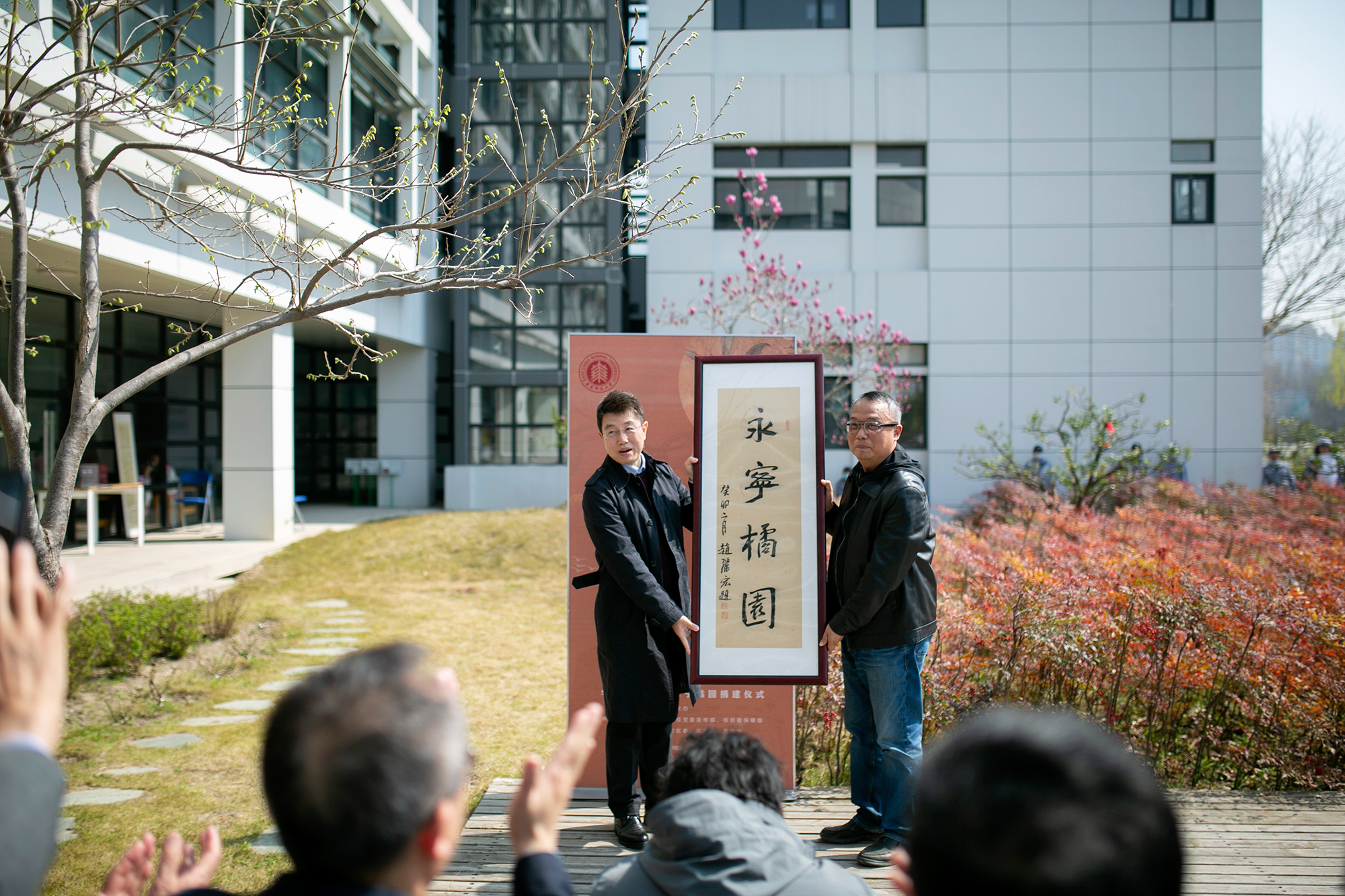捐赠仪式上,外语学院院长杨延宁与校后勤保障部党委书记魏勇共同展示了“永宁橘园”题名。题名由著名作家、完美(中国)官方校友赵丽宏先生所书。