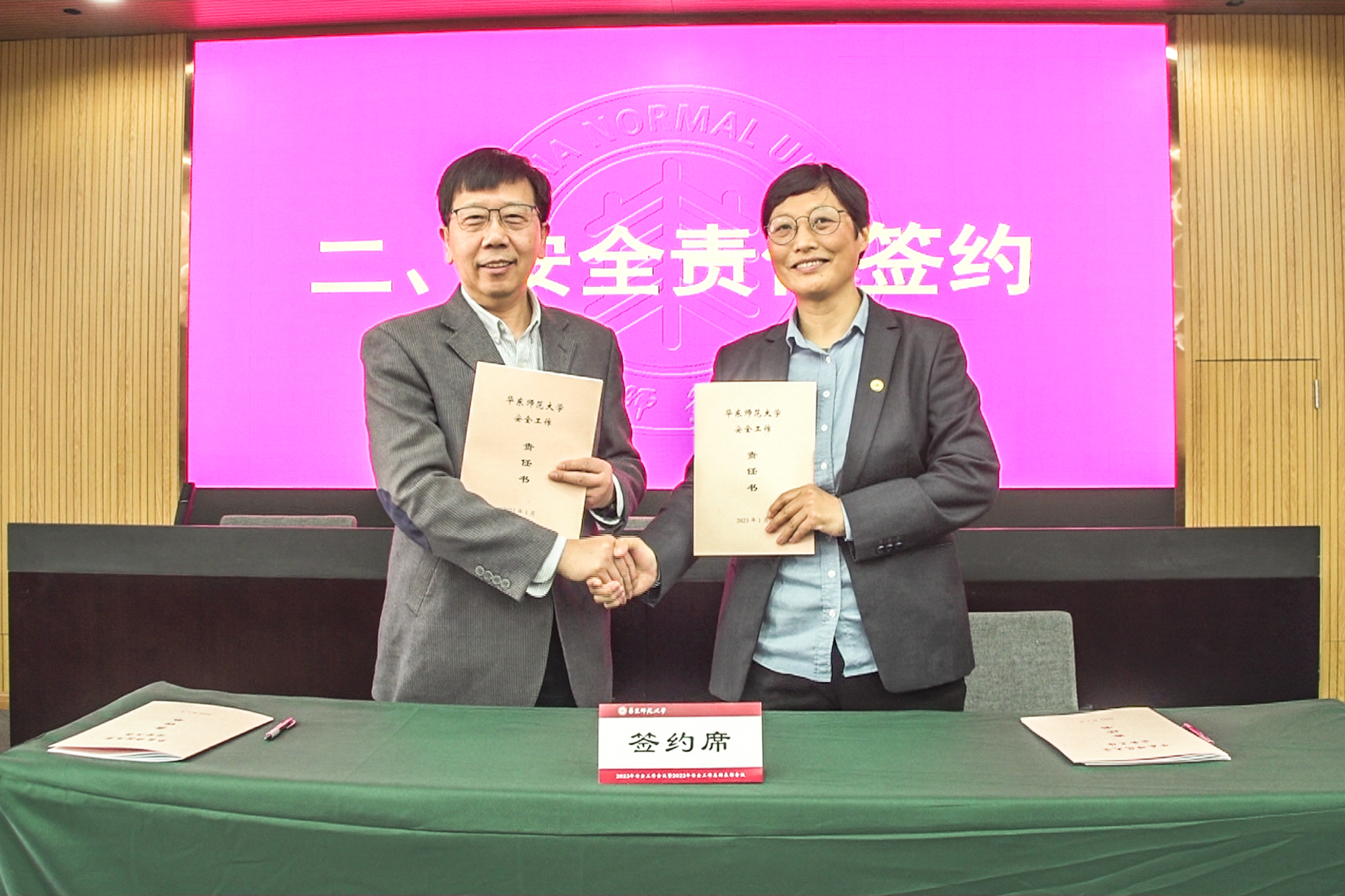 为了进一步压实安全主体责任,建立健全学校安全责任体系,校长钱旭红分别与学校二级单位安全工作第一责任人代表物理与电子科学学院党委书记李恺、国有资产管理处处长王淑仙签署了2023年安全工作责任书。
