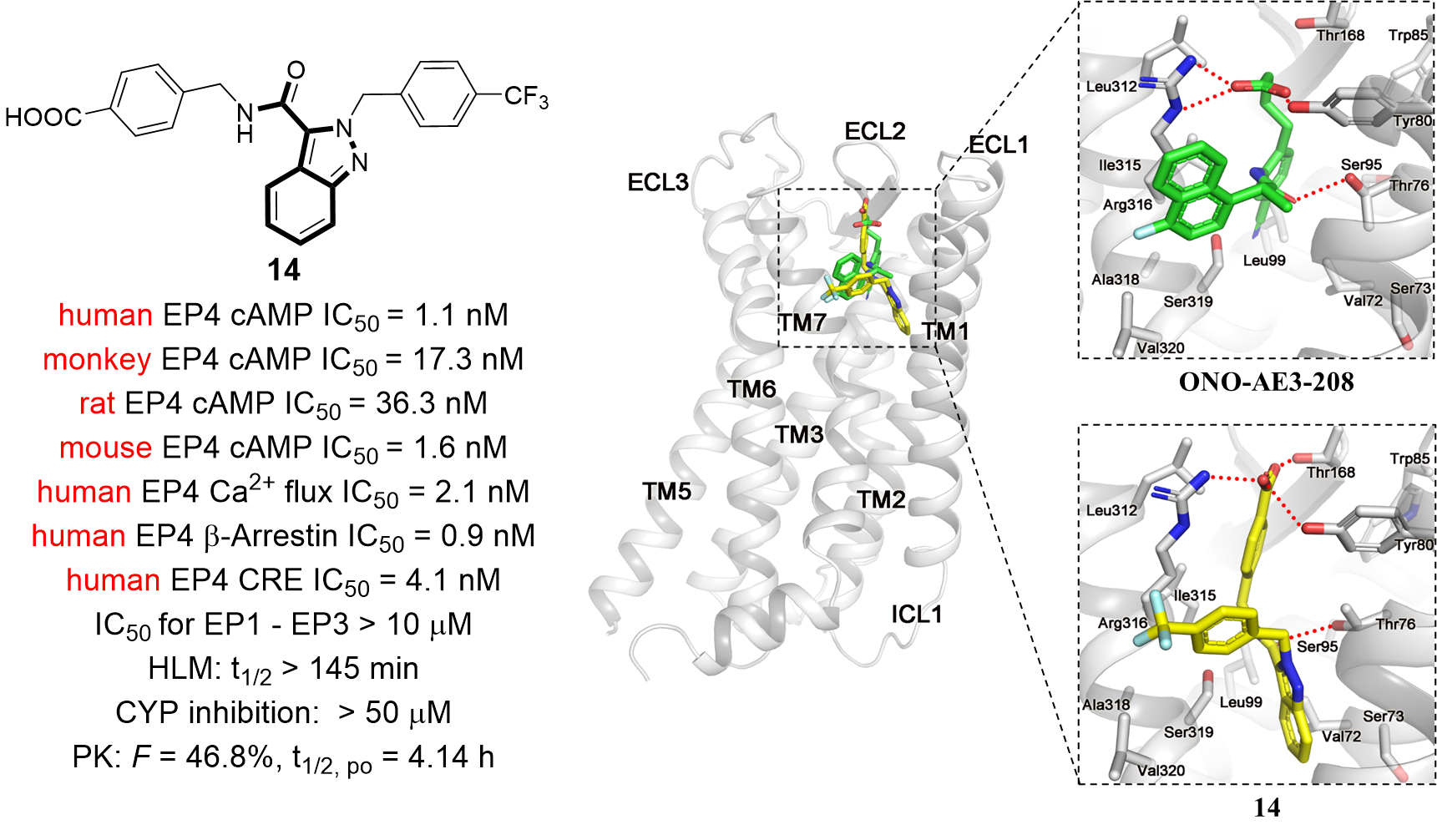 基于前述开发高活性、高选择性EP4拮抗剂的良好基础,团队进一步重点关注对化合物成药性的优化。团队结合已报道的EP4受体晶体结构信息,利用成熟的分子对接技术,开展基于蛋白晶体结构的理性药物分子设计,经过多轮改造和优化,成功获得了具有低nM水平EP4拮抗活性的先导化合物14(IC50= 1.1 nM),与临床分子E7046(IC50= 25.3 nM)相比,其活性提升超过20倍。化合物14展现出优异的亚型选择性,在多种GPCR药物筛选体系中均表现出良好的EP4受体拮抗活性,且不存在种属局限性。此外,化合物14对多种CYP450酶均无明显抑制作用,并展现出优异的代谢稳定性,更优的口服生物利用度和良好的安全性。