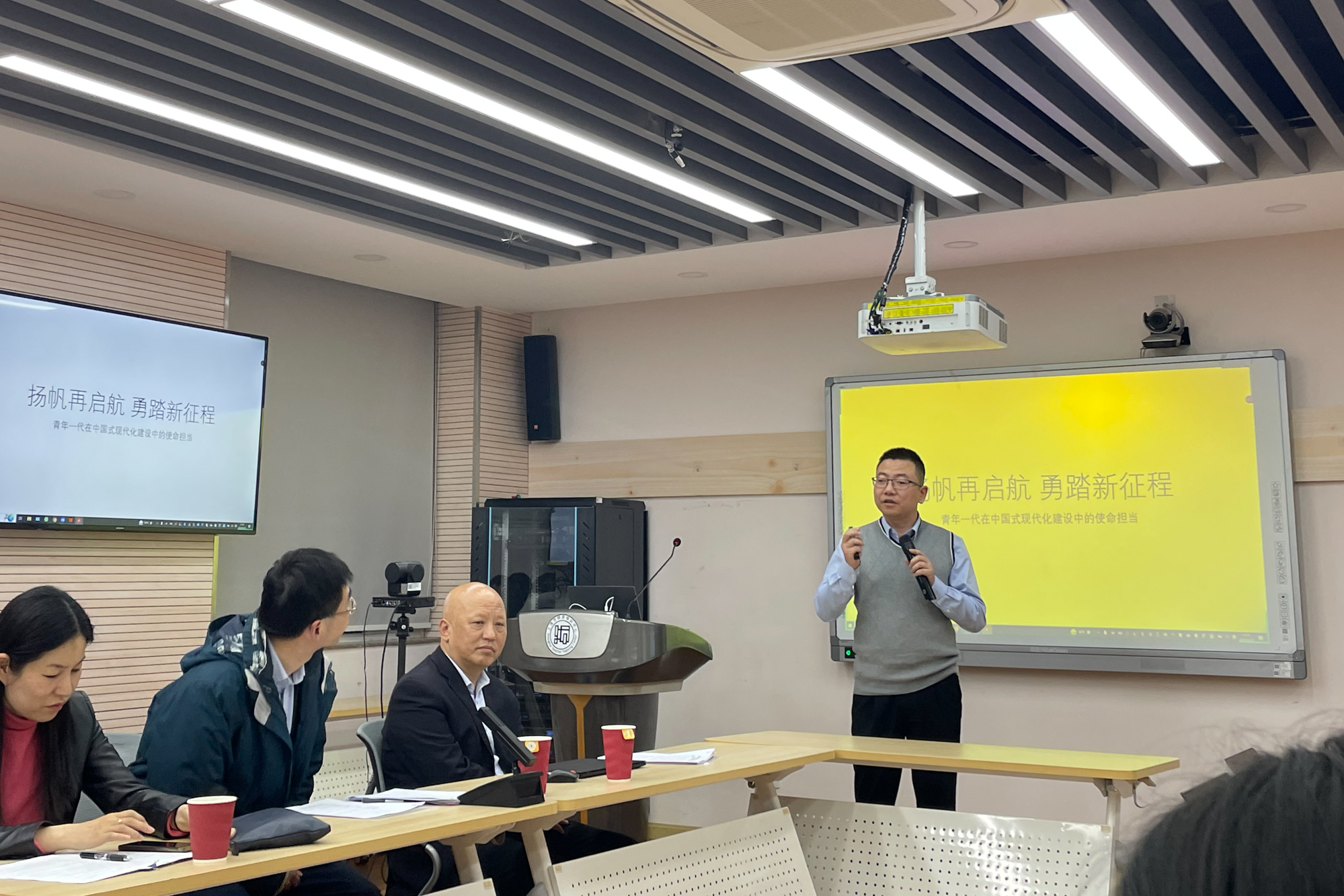 高中组长孙大盟老师以《科技赋能先进制造 劳动创造美好》为主题,以临港新片区为中国式现代化发展的特色案例,呈现现代化发展的中国经验。高校组丁一、王茜、孙义文老师共同讲授了以《扬帆再起帆、勇踏新征程》为主题,立足制度供给、政策创新、区域协同等新发展格局,通过对可能性到现实性的深度分析,不仅加深了对中国式现代化发展的认识和理解,同时深化了同学们对中国式现代化发展的主人翁意识。