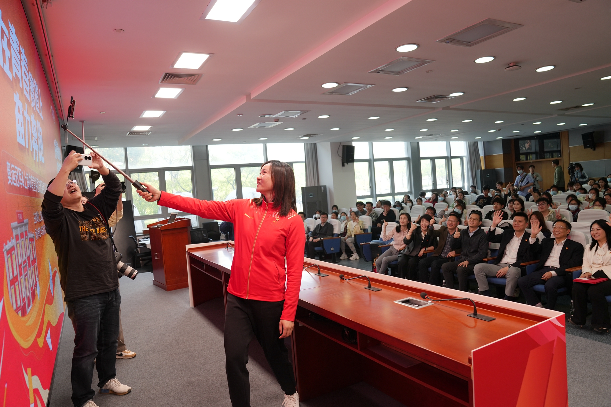 两届奥运会冠军钟天使,结合亲身经历,以“传承为国争光红色基因 勇担体育强国时代使命”为主题,从科技创新助力奥运夺牌、中华体育精神助力民族文化传播、生态文明建设助力乡村振兴三个角度,分享了对党的二十大精神的学习感悟与思考。