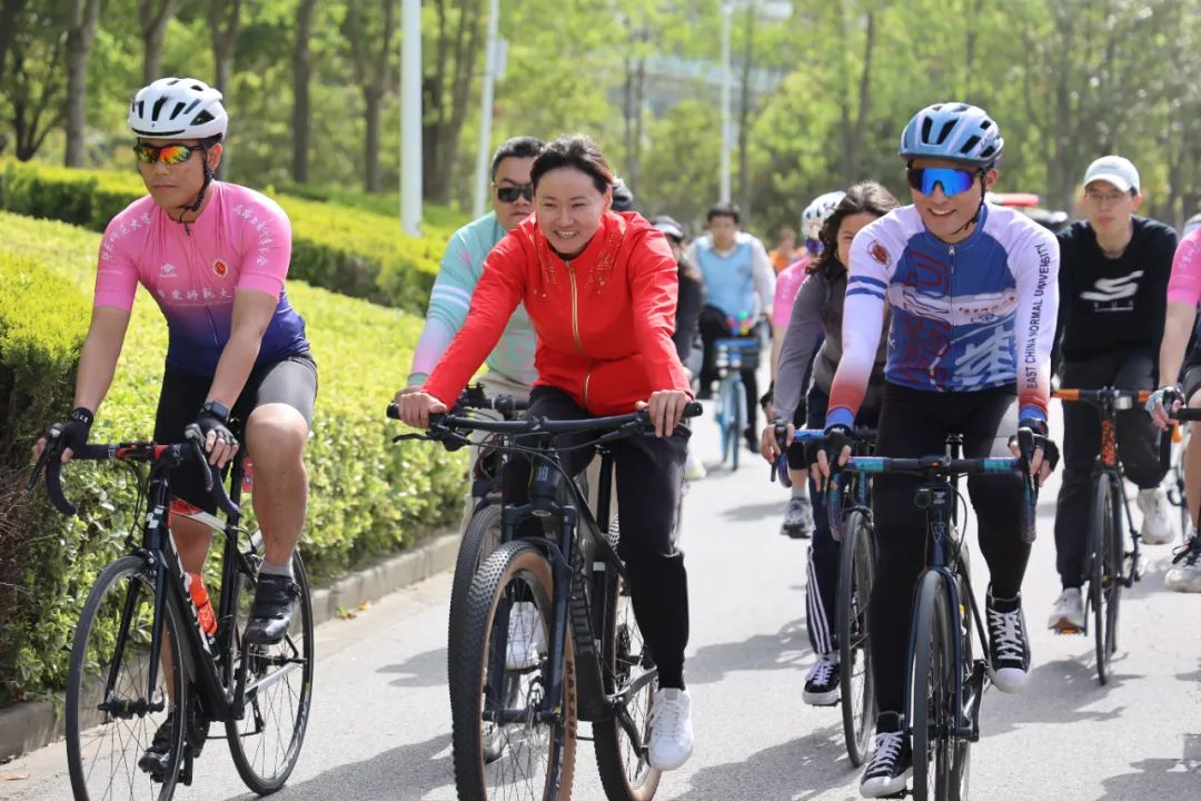发令枪响后,钟天使带领骑行团从图书馆出发,沿着“文脉廊—樱桃河”环骑校园,奥运红、单车蓝与师大青年的青春身影共同构成了春日校园中最生动的一抹亮色。