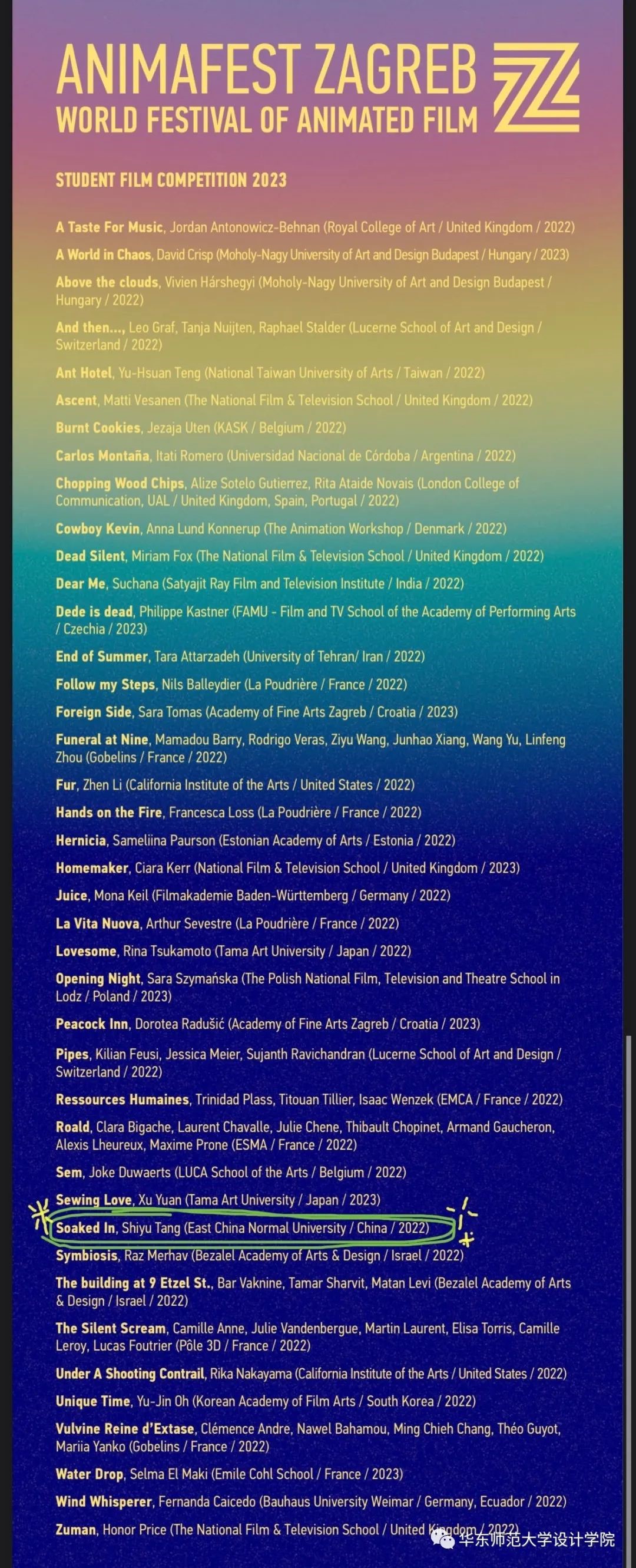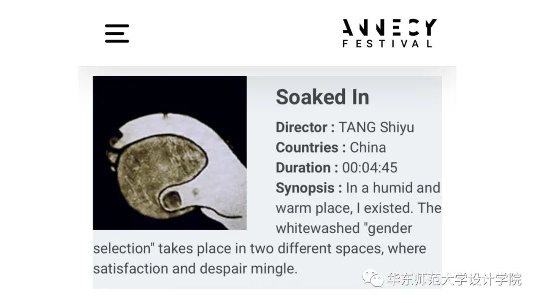 19级动画专业本科生唐诗雨的作品《泡》(Soaked In)分别从两大国际著名的动画电影节参赛选手中脱颖而出。今年,昂西国际动画节一共收到了来自112个国家的3250个有效投稿,仅有两部中国学生作品入选;萨格勒布动画节的学生单元由全球投递的830部学生作品中选出的41部组成,《泡》是该单元中唯一一部来自中国大陆的学生动画作品。