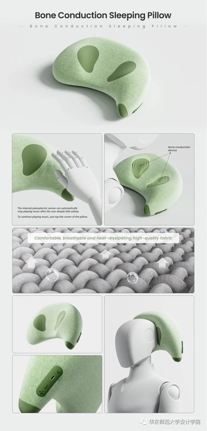 Bone Conduction Sleeping Pillow睡眠枕依据人体工程学原理,采用不规则的外观设计,内置骨传导设备、压力与压电传感器。其骨传导设备弧度贴合人体颞骨,实现了陷波音乐(Notched music)的高效传动,缓解听障人士的耳鸣症状。内部压电传感器可实时监测呼吸与脉搏频率,在用户进入深度睡眠后自动停止播放音乐,实现智能简便的人机交互。